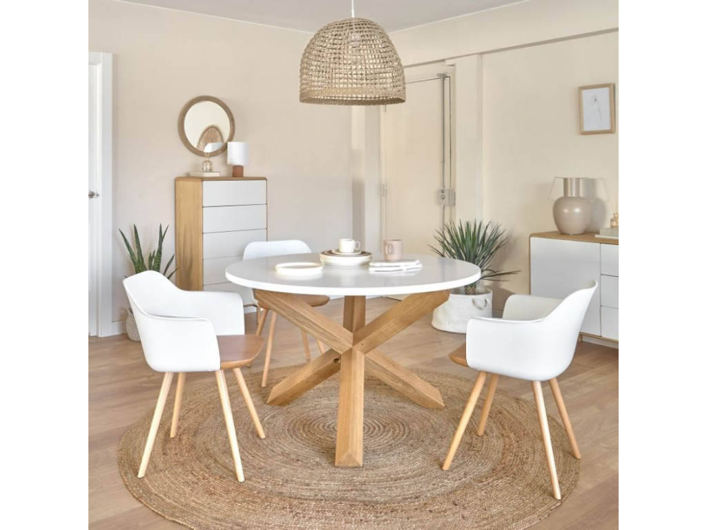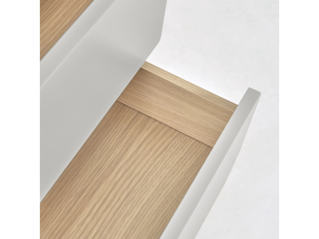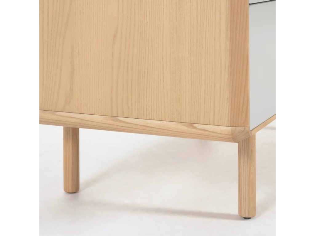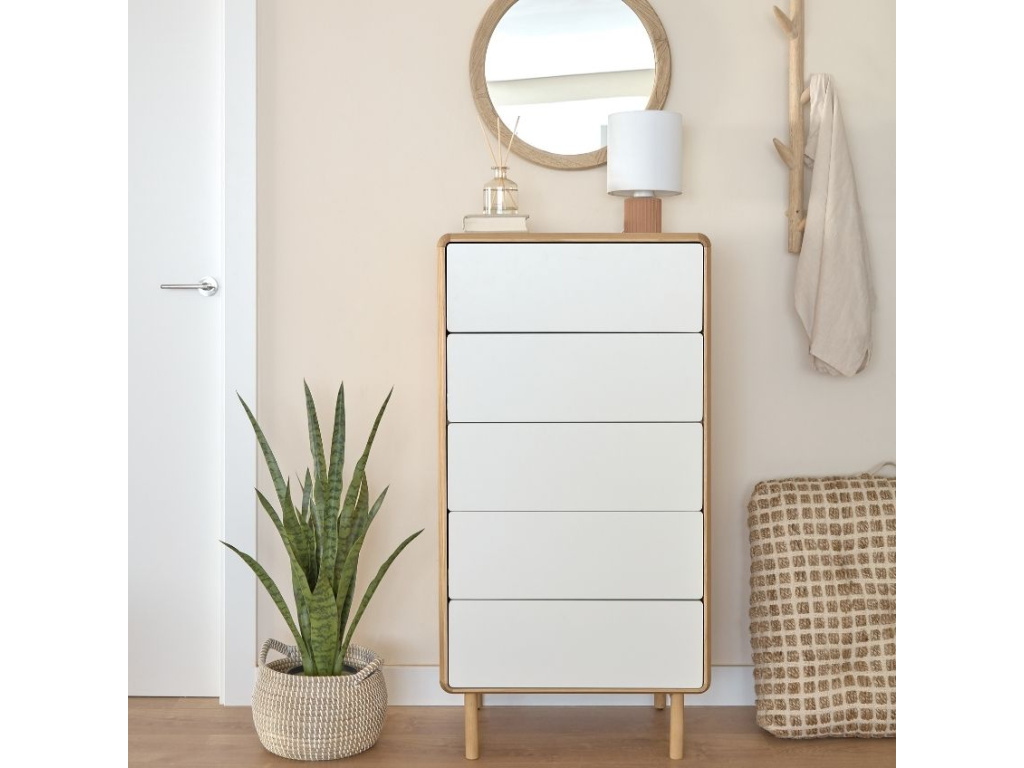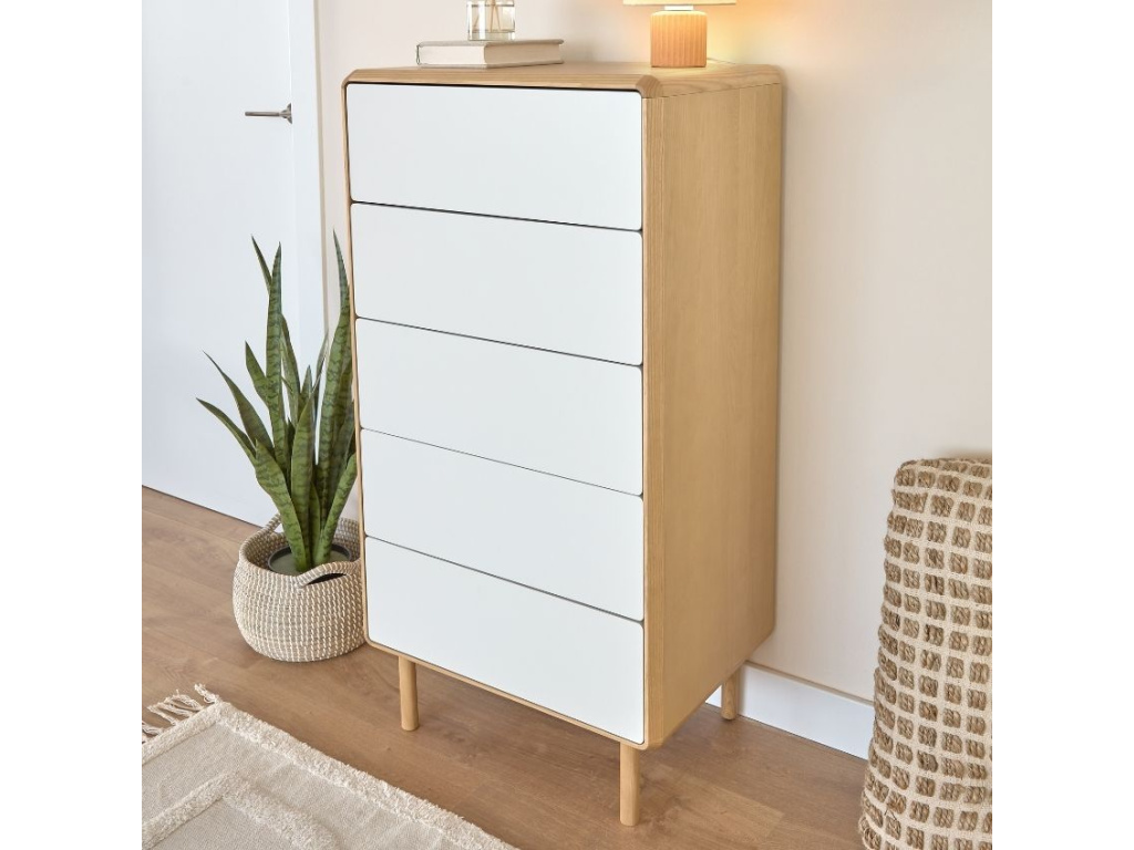 Komoda Anielle značky Kave Home nabízí úložný prostor v podobě pěti zásuvek. Zaujme kombinací bílé a přírodní barvy. Je vyrobená z jasanové dýhy a masivního jasanového dřeva, které na přední straně doplňuje šedobíle lakované MDF. Moderní design s nádechem severského stylu interiér oživí a přinese s sebou útulnou atmosféru. V sérii Anielle najdete další produkty, které lze vkusně kombinovat.