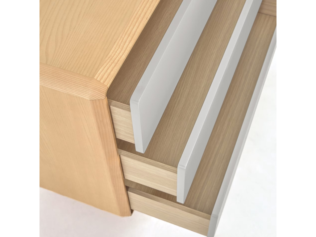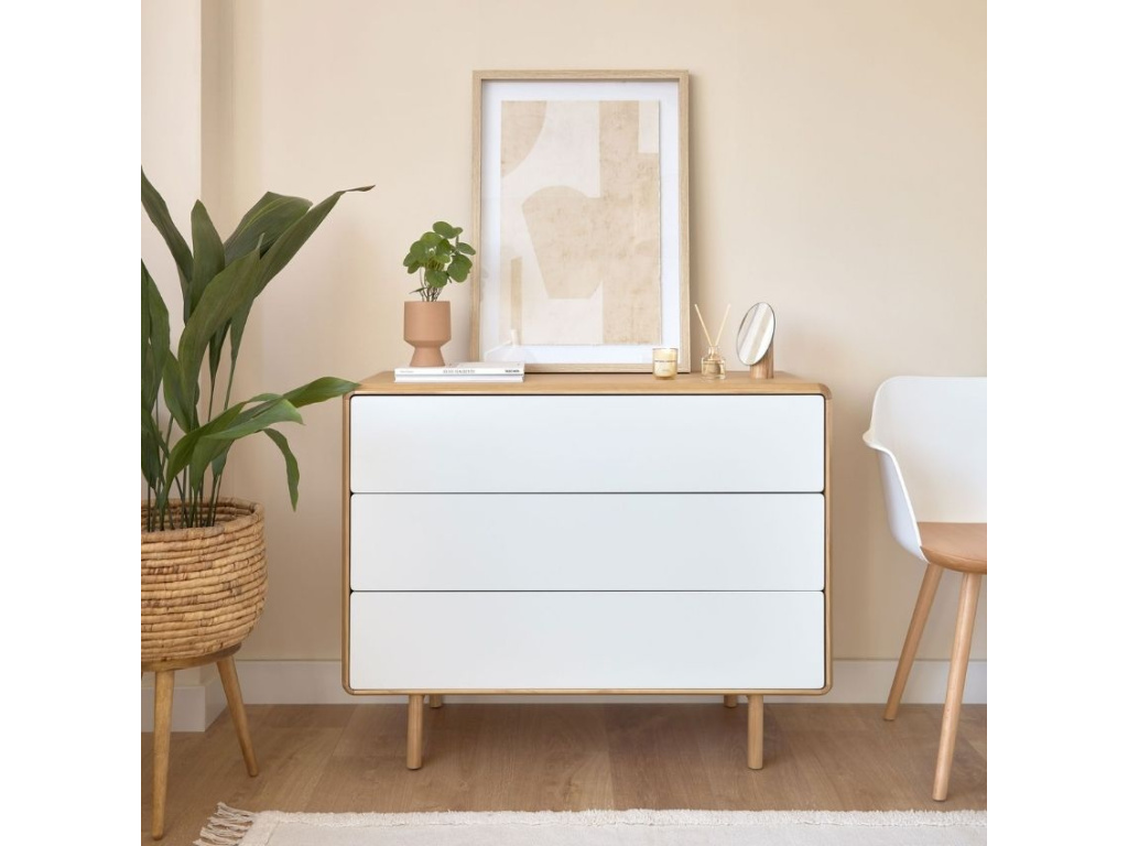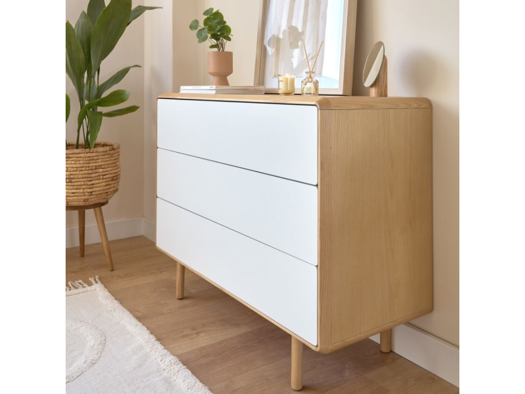 Komoda Anielle značky Kave Home nabízí úložný prostor v podobě tří prostorných zásuvek. Zaujme kombinací bílé a přírodní barvy. Je vyrobená z jasanové dýhy a masivního jasanového dřeva, které na přední straně doplňuje šedobíle lakované MDF. Moderní design s nádechem severského stylu interiér oživí a přinese s sebou útulnou atmosféru. V sérii Anielle najdete další produkty, které lze vkusně kombinovat.