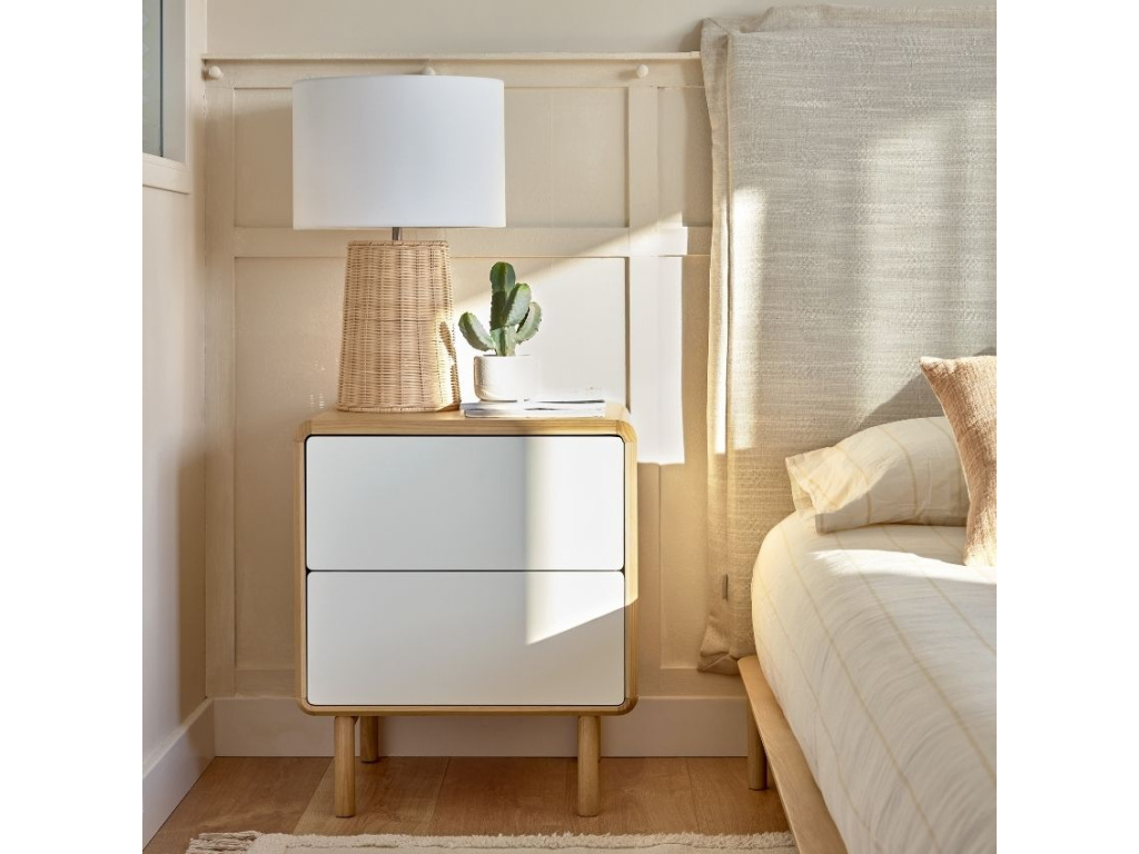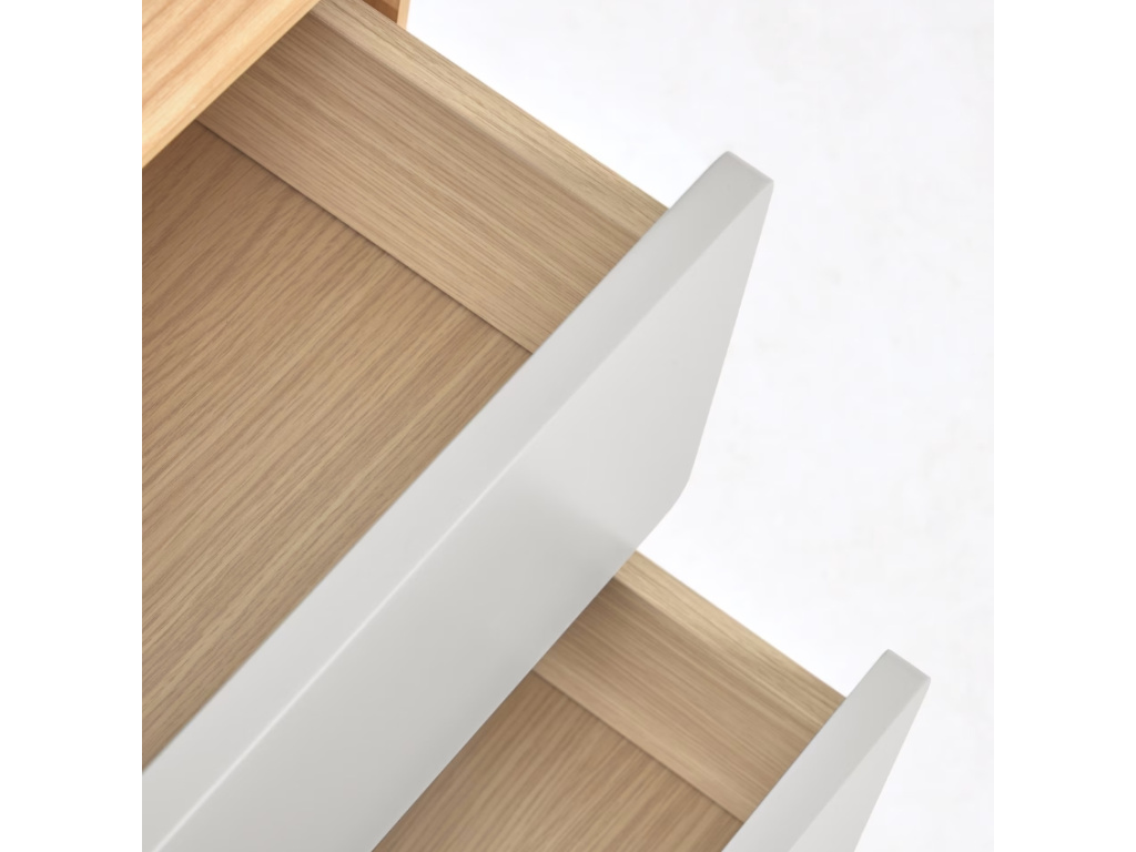 Noční stolek Anielle značky Kave Home nabízí úložný prostor v podobě dvou zásuvek. Zaujme kombinací bílé a přírodní barvy. Je vyroben z jasanové dýhy a masivního jasanového dřeva, které na přední straně doplňuje šedobíle lakované MDF. Moderní design s nádechem severského stylu vaši ložnici oživí a přinese s sebou útulnou atmosféru. V sérii Anielle najdete další produkty, které lze vkusně kombinovat.