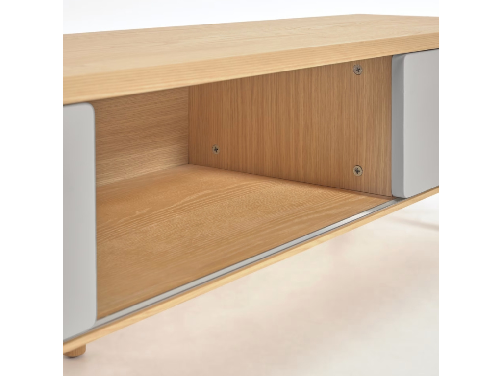 TV stolek značky Kave Home nabízí úložný prostor v podobě tří polic s posuvnými dvířky. Samy si zvolíte, která z polic zůstane otevřená a které police budou schované. TV stolek zaujme kombinací šedobílé a přírodní barvy. Je vyrobený z jasanové dýhy a masivního jasanového dřeva, které na přední straně doplňuje bíle lakované MDF. Moderní design s nádechem severského stylu interiér oživí a přinese s sebou útulnou atmosféru. V sérii Anielle najdete další produkty, které lze vkusně kombinovat.