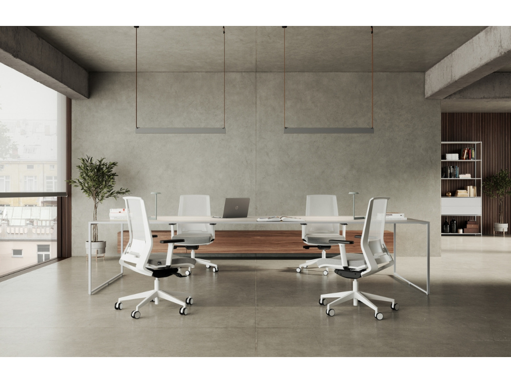 otočná pracovní židle • výškově stavitelná • čalouněný sedák, síťovaný opěrák • opěrák čalouněný síťovinou NET, výškově stavitelná bederní opěrka • bílý nylonový rám opěráku a kryt sedáku • bílá krytka pístu • 5-ramenný nylonový kříž, bílý • kolečka s pryží na tvrdé podlahy, bílá, Ø 55 mm • synchronní mechanika AT