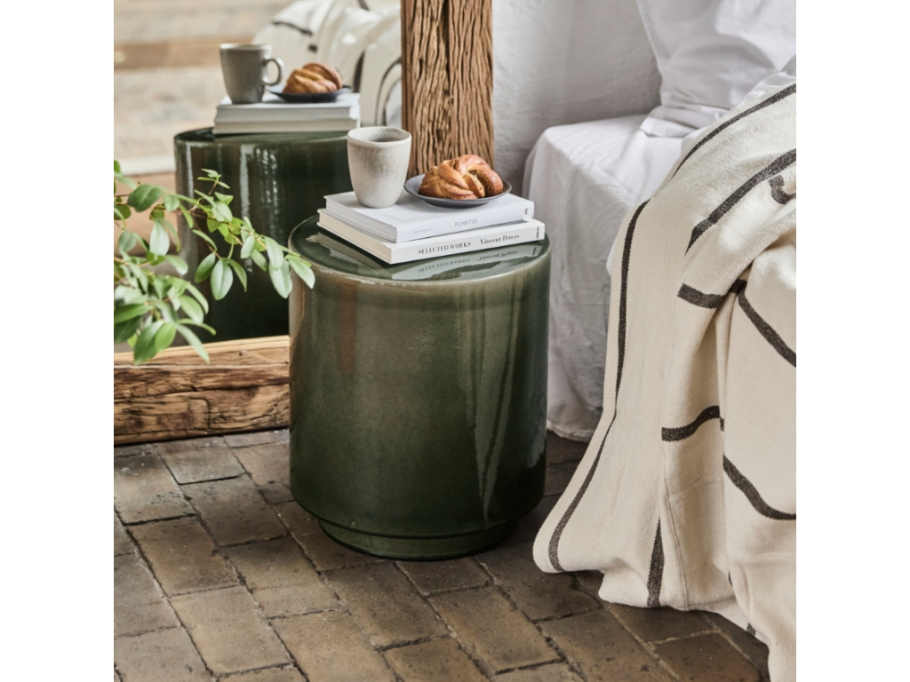 Zelený keramický odkládací stolek Thea je designový kousek, který zaujme svým lesklým povrchem a jedinečnými odstíny zelenohnědé glazury. Ruční výroba zaručuje, že každý stolek je originál s vlastní charakteristickou texturou. Využijete ho například jako odkládací stolek v obývacím pokoji, noční stolek v ložnici nebo jako stojan na pokojové květiny. K dostání je ve dvou barevných variantách.