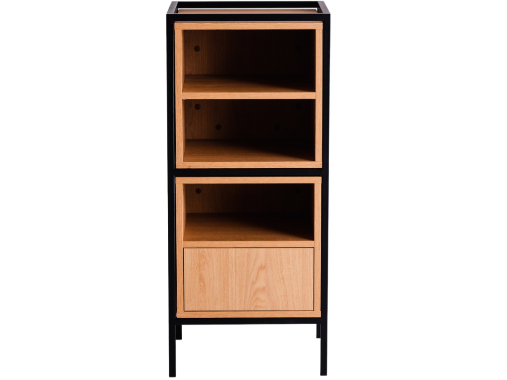 Kolekce modulárních úložných prostor Skipo představuje stylový nábytek, který si jednoduše nakombinujete podle vašich představ. Najdete v ní několik velikostí skříněk, které mohou být využity jako knihovny, komody, noční stolky nebo třeba TV stolky. Zkrátka je použijte tam, kde je potřeba! Spojení dubového dekoru a kovového rámu je nadčasové a skvěle zapadne do minimalistických i industriálních prostor. Knihovna Skipo je vysoká 102 cm a disponuje třemi otevřenými policemi a jednou zásuvkou, dostupná je také v černém provedení. Využít ji ale nemusíte jen na knížky, skvěle se hodí také na různé dekorace a cennosti.