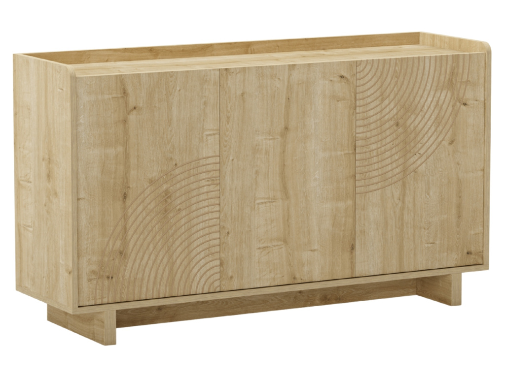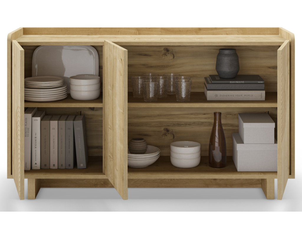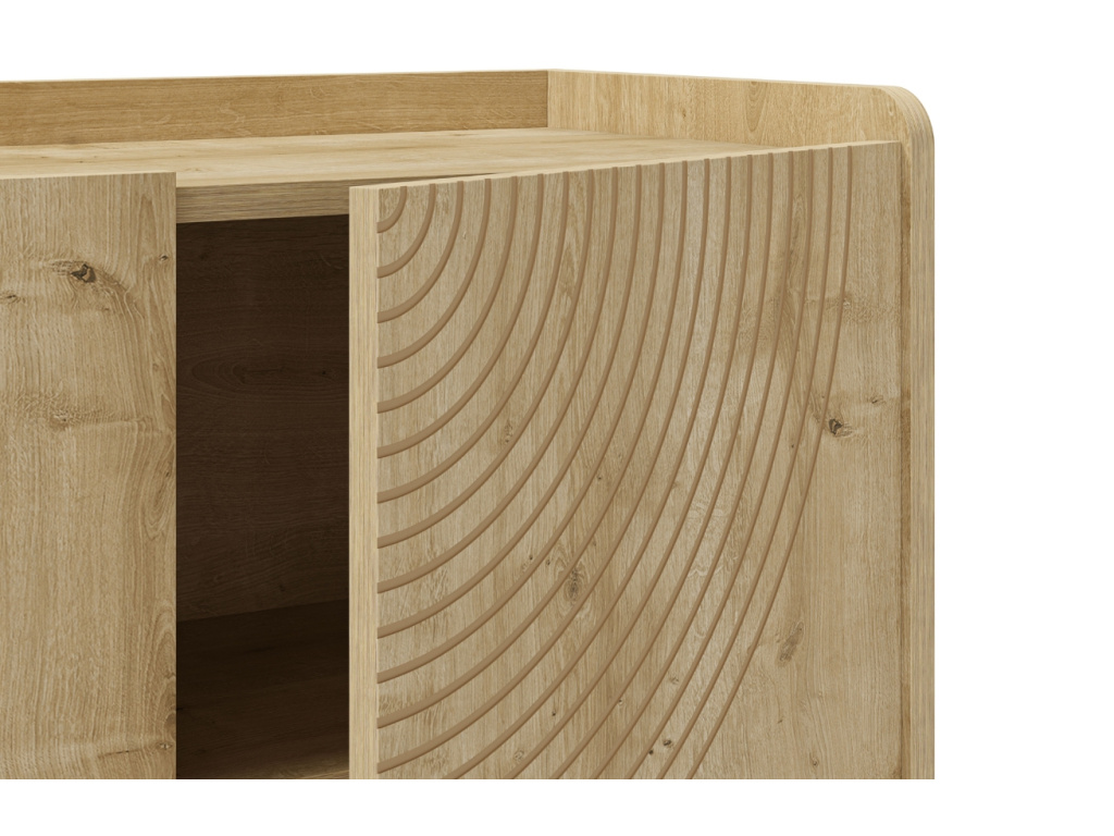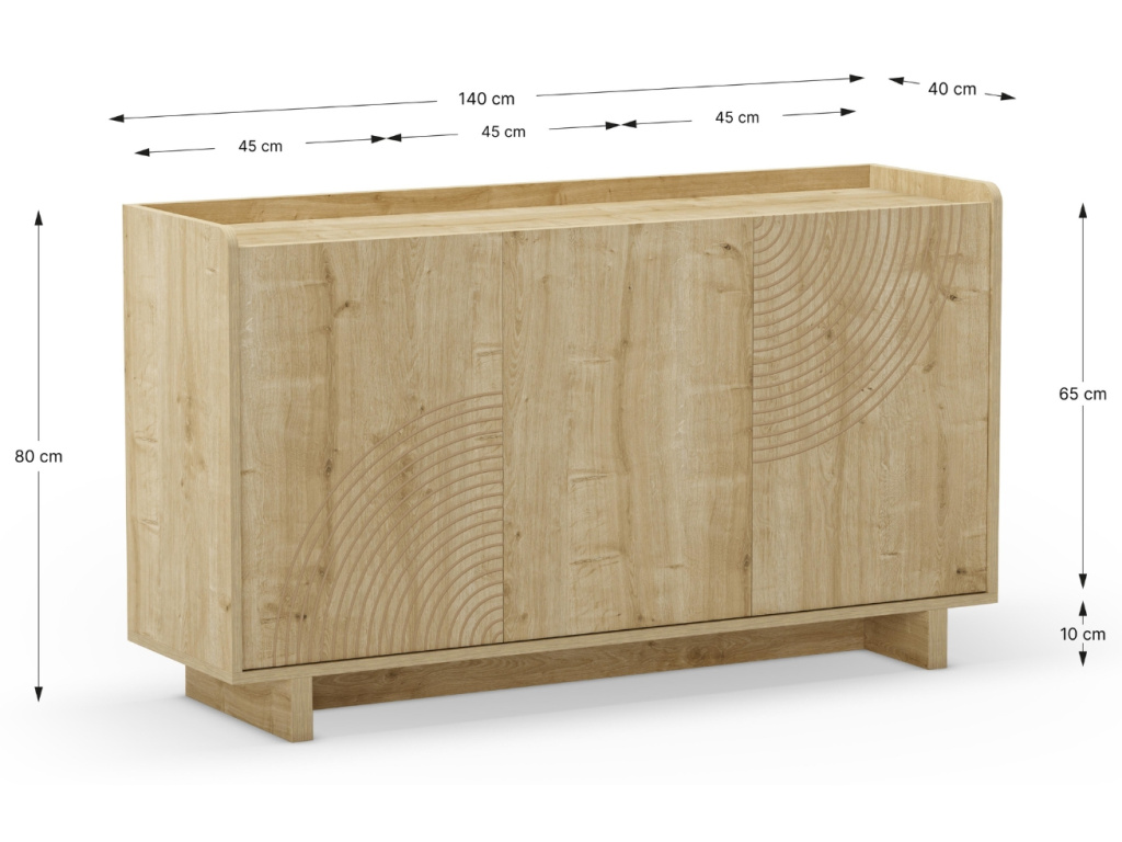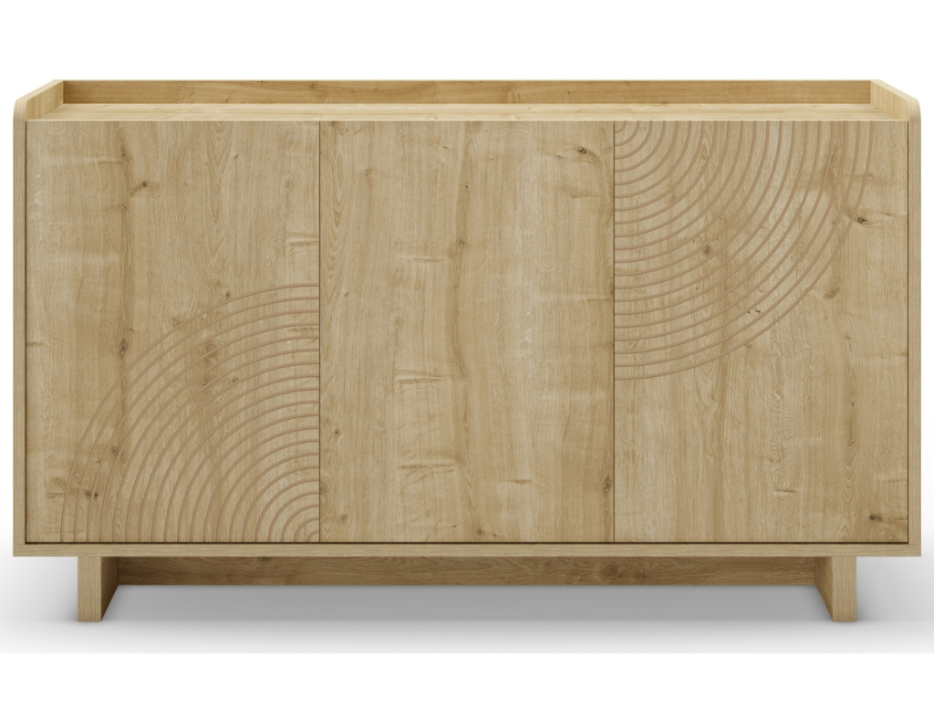 Komoda Daira je elegantním spojením přírody a moderní jednoduchosti. Čisté linie a dubový dekor na kvalitním laminátu dodávají komodě lehkost a nadčasový styl. Praktické vnitřní uspořádání s policemi nabízí dostatek úložného prostoru do každé místnosti – ať už do kuchyně, obývacího pokoje nebo ložnice. Design dvířek ozvláštňuje jemný reliéf v podobě půlkruhových linií, které dodávají komodě osobitý výraz. Kolekce Daira zahrnuje konferenční stolek, tři varianty komod a dva velikostní typy TV stolků.