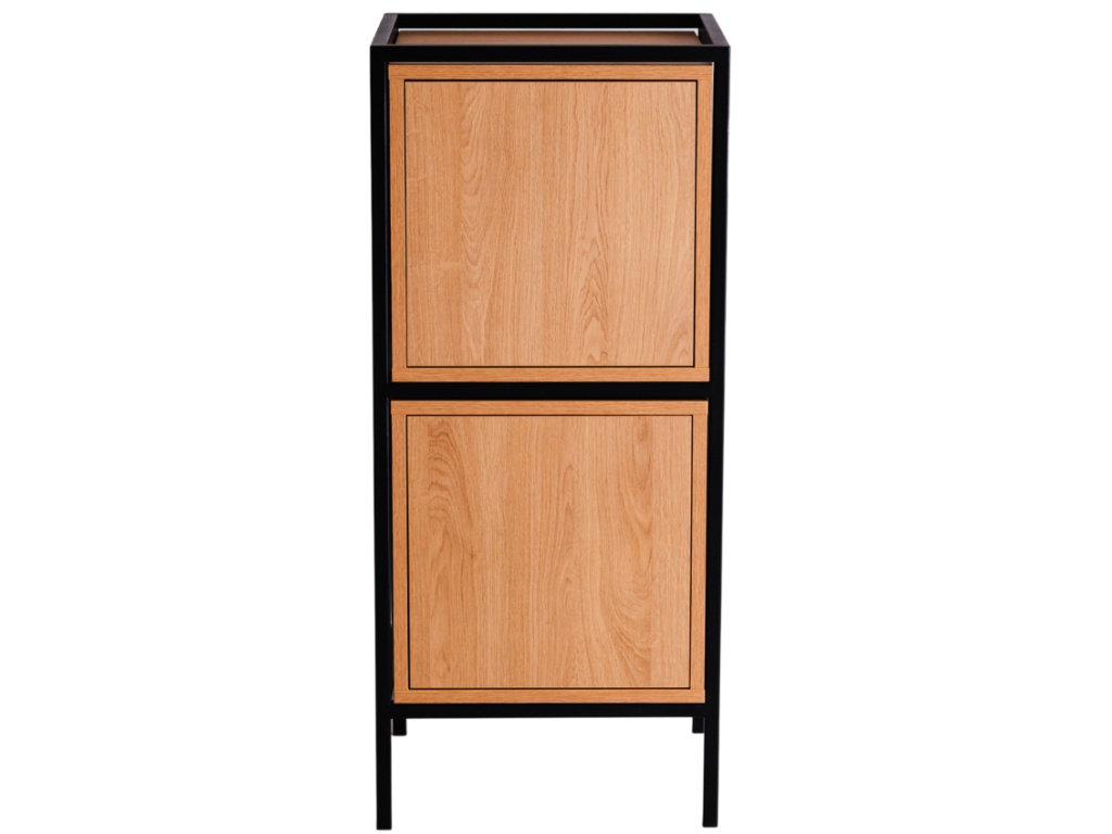 Kolekce modulárních úložných prostor Skipo představuje stylový nábytek, který si jednoduše nakombinujete podle vašich představ. Najdete v ní několik velikostí skříněk, které mohou být využity jako knihovny, komody, noční stolky nebo třeba TV stolky. Zkrátka je použijte tam, kde je potřeba! Spojení dubového dekoru a kovového rámu je nadčasové a skvěle zapadne do minimalistických i industriálních prostor. Komoda Skipo je vysoká 102 cm a disponuje dvěma uzavřenými policemi s dvířky, dostupná je také v černém provedení.