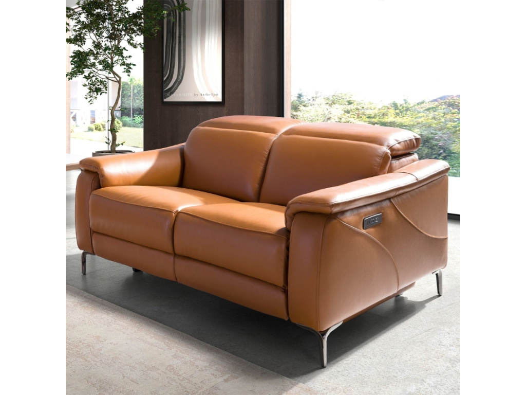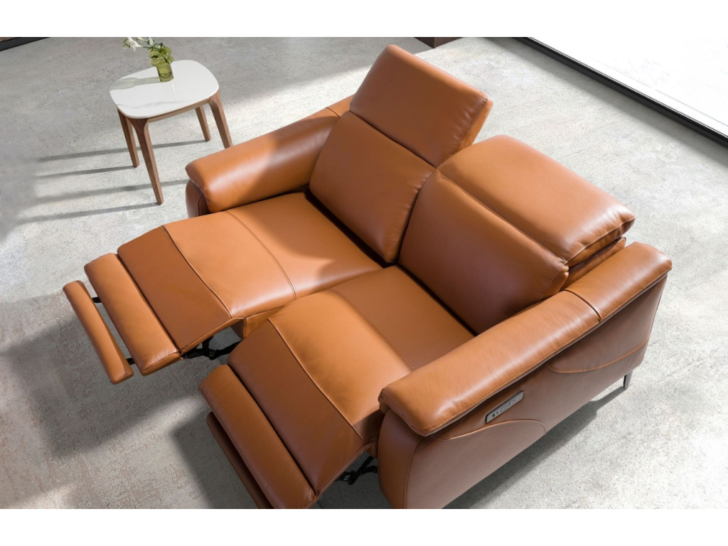 Vneste do svého obývacího prostoru šarm s touto pohovkou v nádherném odstínu koňakové hnědi. Její měkké linie a kvalitní hovězí kůže budou příjemným společníkem i pro ty nejnáročnější. Relaxační mechanismy s elektrickým ovládáním vám umožní nezávisle nastavit opěrku hlavy, zad i nohou – ideální pro chvíle zaslouženého odpočinku. Díky pevné chromované podnoži z nerezové oceli získává pohovka nejen stabilitu, ale i moderní nádech. Zabudované USB a USB-C porty oceníte pro nabíjení vašeho elektro zařízení, u kterého si budete moci užívat ničím nerušené pohodlí.
