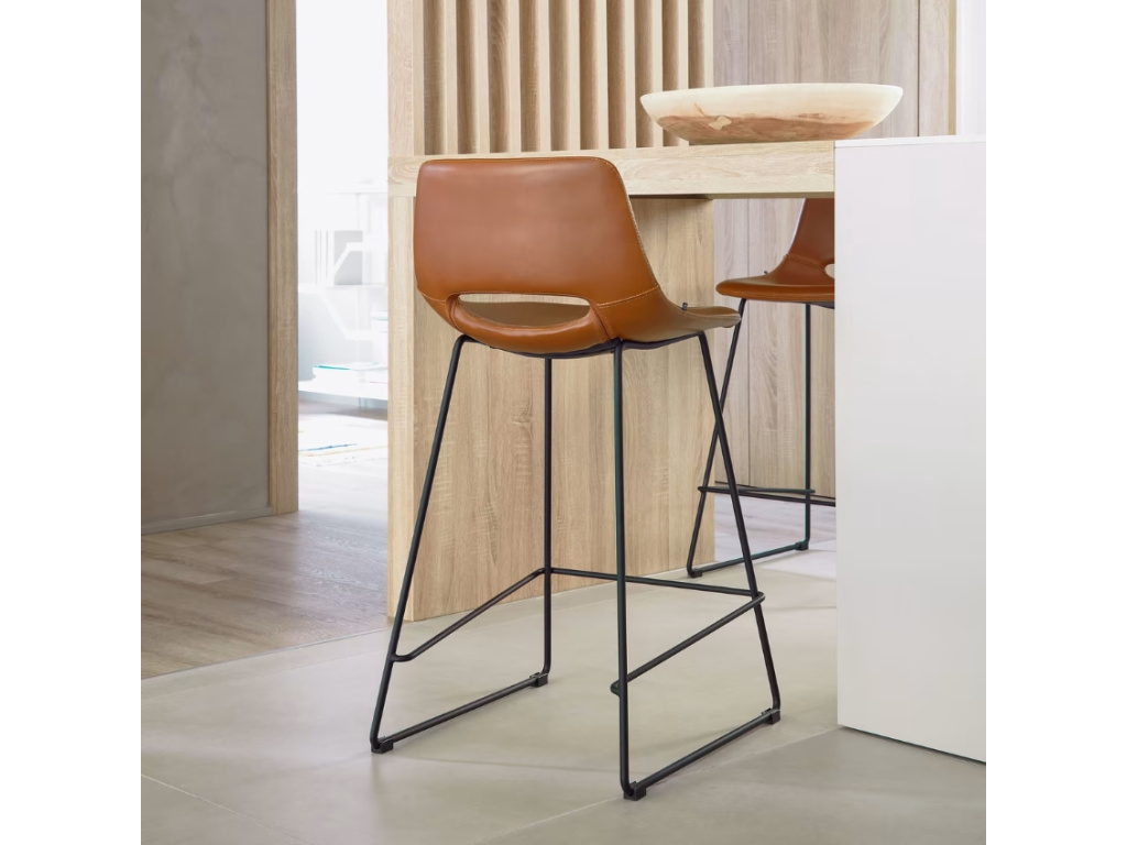 Moderní barová židle Kave Home Zahara s tvarovaným sedákem z ekokůže zaujme svým originálním designem. Podnož tvoří lakovaný kov v černém odstínu, jenž společně se sedákem dodávají barové židli jedinečný a příjemný design. Vychutnejte si posezení s elegancí a s nadstandardním designem ve stylu retro.