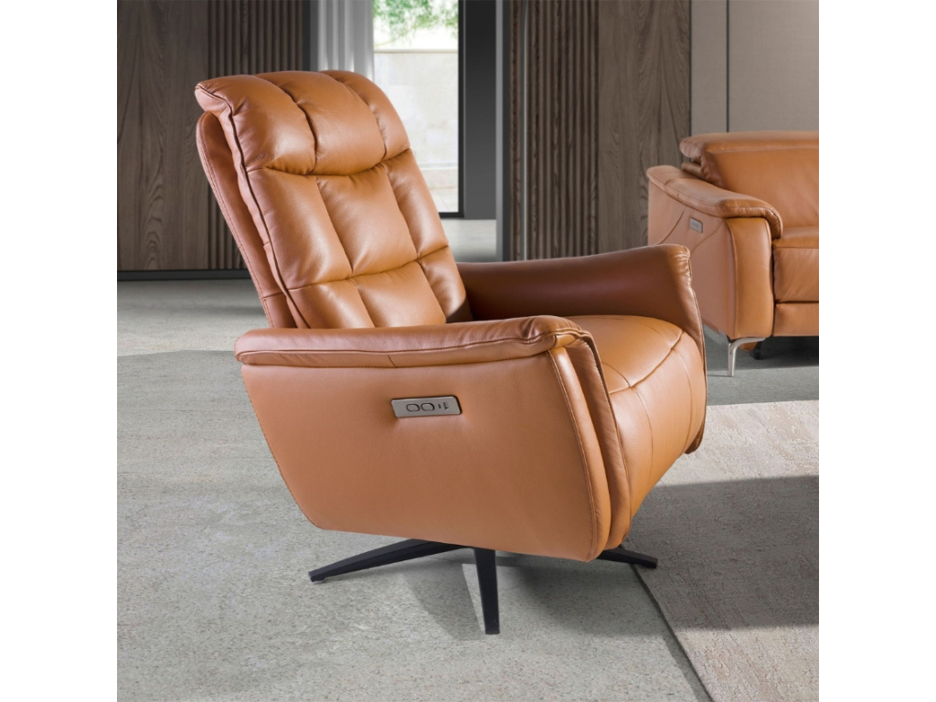 Toto otočné křeslo se stane vaším společníkem pro chvíle relaxace i moderní designovou ozdobou obývacího prostoru. Jeho jemné křivky a čalounění z kvalitní hovězí kůže přinesou do místnosti eleganci a černá lakovaná podnož z nerezové oceli podtrhne jeho současný styl. Elektrický relaxační mechanismus vám umožní nastavit opěrku zad a nohou přesně podle vašich potřeby, a USB i USB-C porty vám usnadní nabíjení elektro zařízení, které chcete mít při odpočinku po ruce. Tento kousek spojuje estetiku s funkčností – vše, co očekáváte od moderního nábytku.