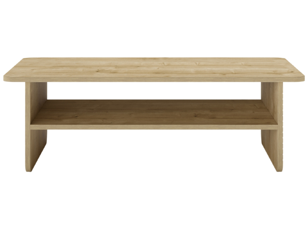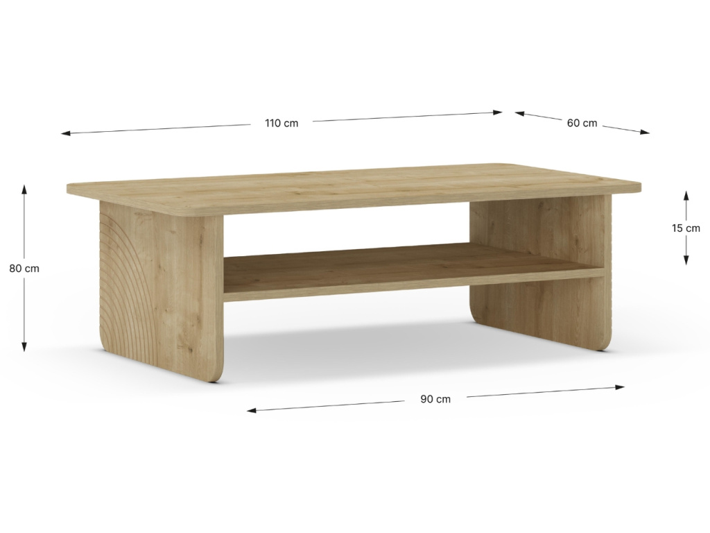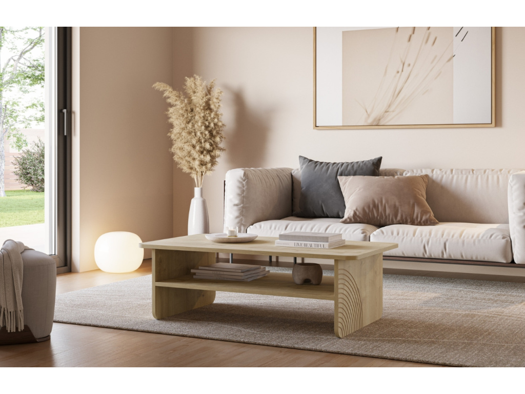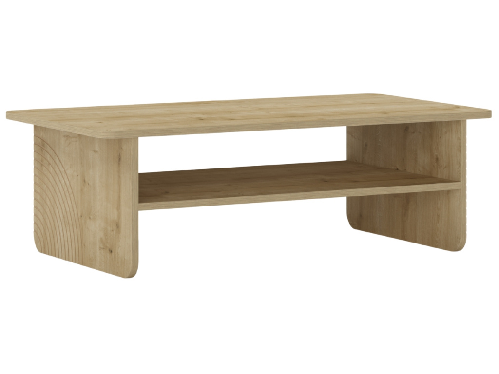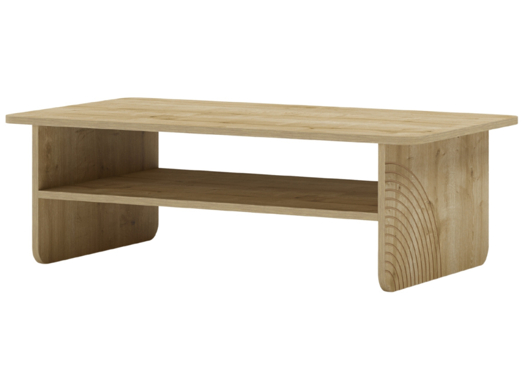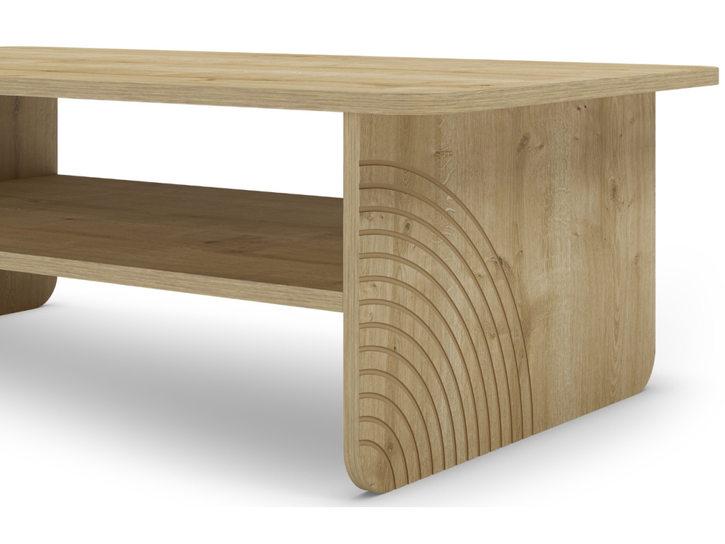 Konferenční stolek Daira zaujme čistým designem a příjemným dubovým dekorem, který vnese do interiéru teplo a přirozený vzhled. Jeho jednoduché linie doplňuje praktická odkládací police pro časopisy, ovladače nebo drobnosti každodenního života. Zaoblené hrany dodávají stolku jemnost a bezpečnost, ideální i do domácností s dětmi. Charakteristickým prvkem jsou půlkruhové reliéfy na bočních stranách, které kolekci Daira propůjčují osobitý styl. Kolekce zahrnuje také tři varianty komod a dva velikostní typy TV stolků.