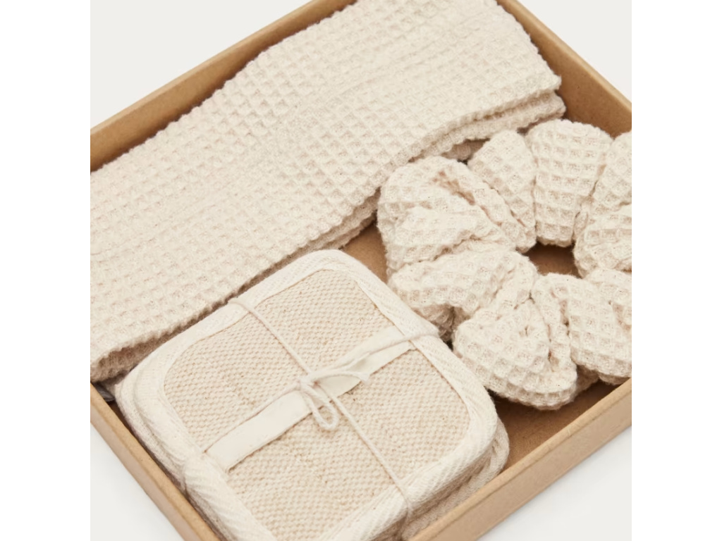 Věnujte své pleti potřebnou péči se sadou Kave Home Menelik v jemných béžových tónech. Najdete v ní pomůcky k řádnému vyčištění a peelingu obličeje – čelenku a gumičku na zachycení vlasů společně s odličovacími tamponky. Díky svým přírodním vláknům z bavlny, lufy, konopí a juty je celá sada ekologičtější variantou, čímž šetří nejen naší planetu, ale také vaší peněženku.