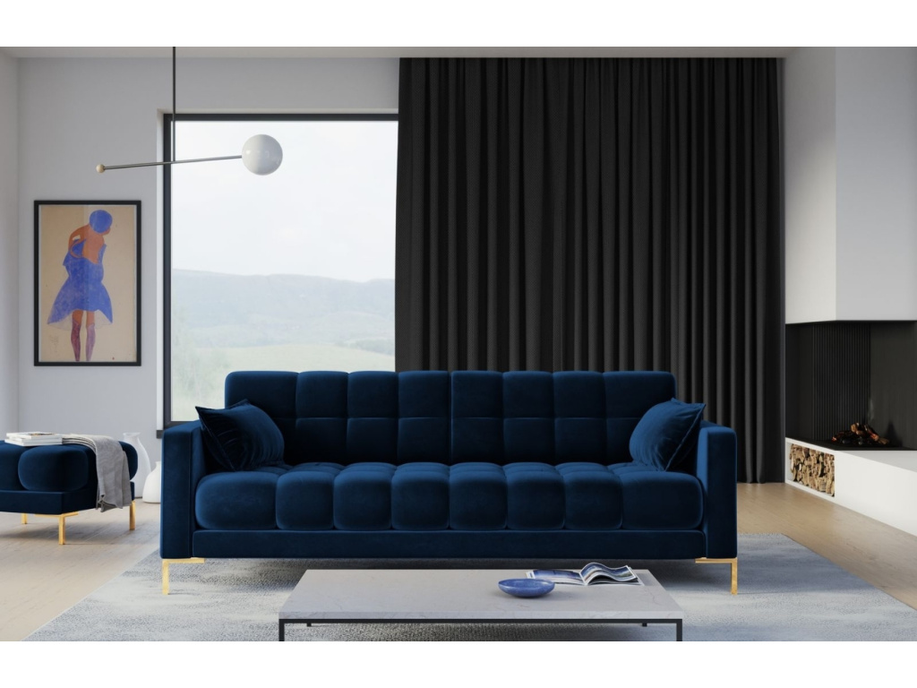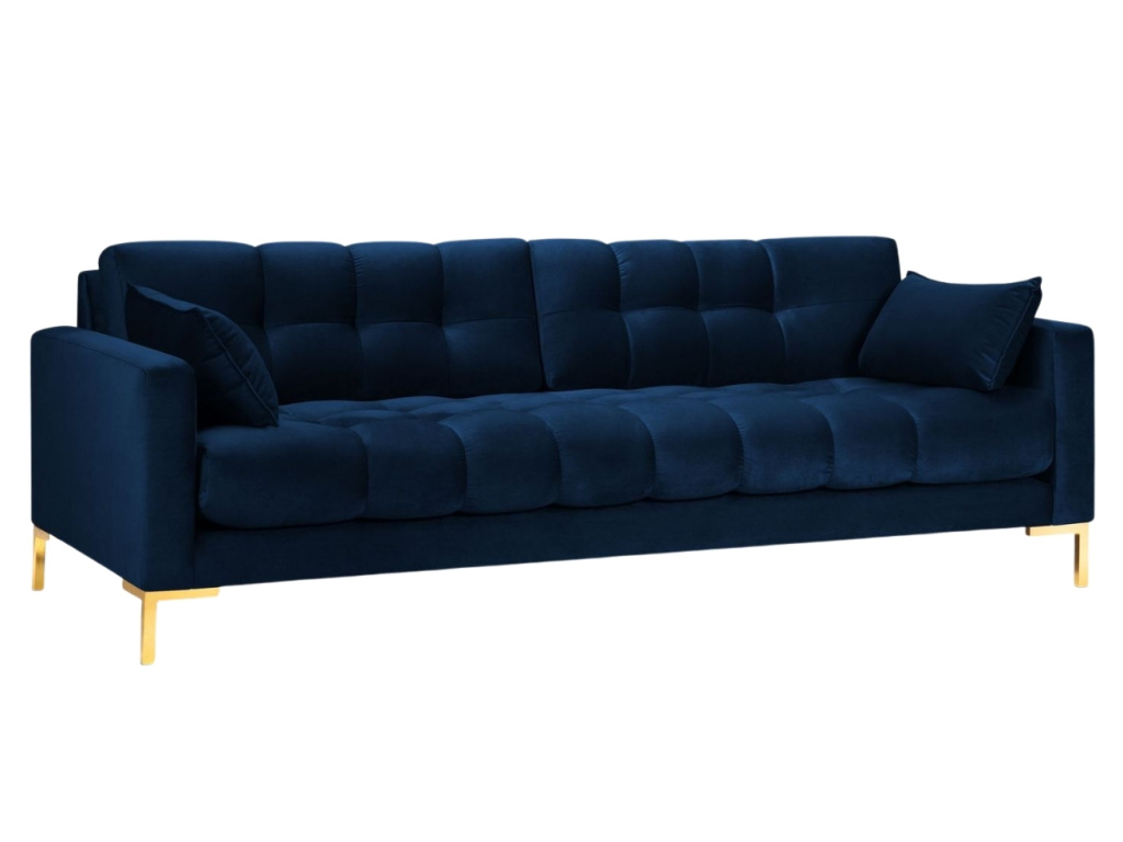 Elegantní čtyřmístná pohovka MICADONI MAMAIA zaujme na první pohled svým nadýchaným vzhledem. Velmi příjemné sametové čalounění a zlatá kovová podnož vytváří kontrast, který interiéru dodá elegantní vzhled a nádech luxusu. Díky zajímavému prošívání vzniká jemný design, který do vašeho domova vnese lehkost a styl. Opěrné polštářky zvednou úroveň vašeho odpočinku o stupeň výš. Nechte se obklopit komfortem ve společnosti pohovky Mamaia.