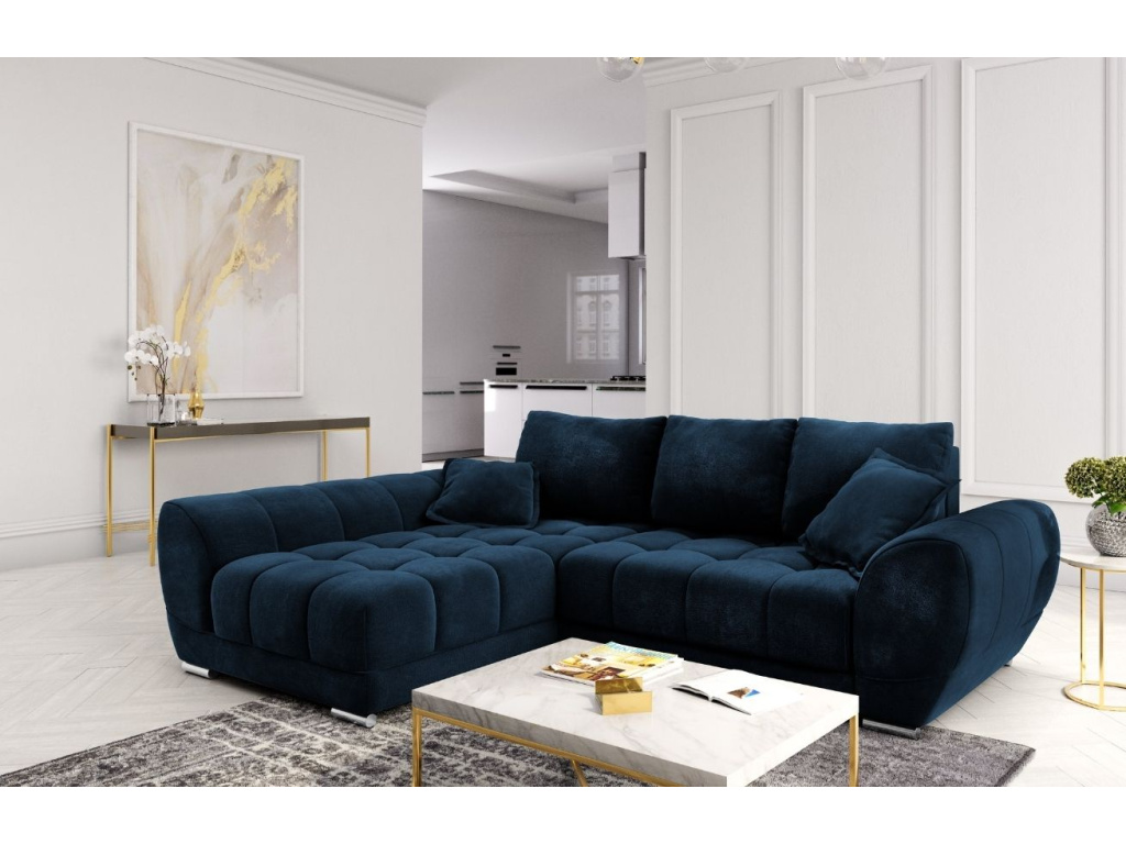 Designová čtyřmístná rohová pohovka Nuage od výrobce Windsor & Co se díky elegantním liniím a jemnému sametovému čalounění v modré barvě stane ideálním místem pro odpočinek, posezení s rodinou, přáteli nebo romantické večery ve dvou. Atraktivní prošívání a minimalistická kovová podnož v kombinaci s látkou příjemnou na dotek dodá vašemu obývacímu pokoji jedinečný styl. Maximální komfort zajistí dva dekorativní polštářky. Látka disponuje voděodolnou technologií, je tedy vhodná pro rodiny s dětmi a domácími mazlíčky. Díky vlastnostem se však hodí i do komerčních prostor jako jsou hotelové haly, apod. Pohovka je rozkládací, rázem se z ní stane pohodlné lůžko pro vaše hosty.