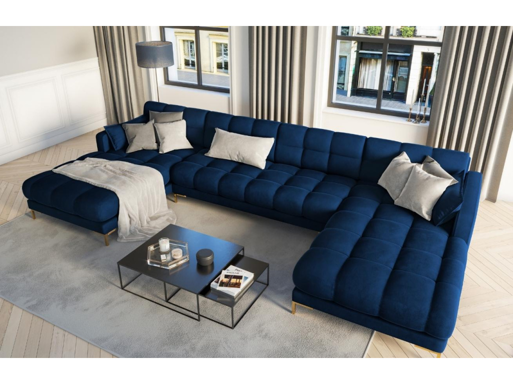 Elegantní šestimístná rohová pohovka MICADONI MAMAIA zaujme na první pohled svým nadýchaným vzhledem. Velmi příjemné sametové čalounění v královsky modré barvě a kovová podnož vytváří kontrast, který interiéru dodá elegantní vzhled a nádech luxusu. Díky zajímavému prošívání vzniká jemný design, který do vašeho domova vnese lehkost a styl. Opěrné polštářky zvednou úroveň vašeho odpočinku o stupeň výš. Díky praktickému tvaru do písmene U získáte rovnoměrně rozdělená místa k odpočinku. Nechte se obklopit komfortem ve společnosti produktů Mamaia.