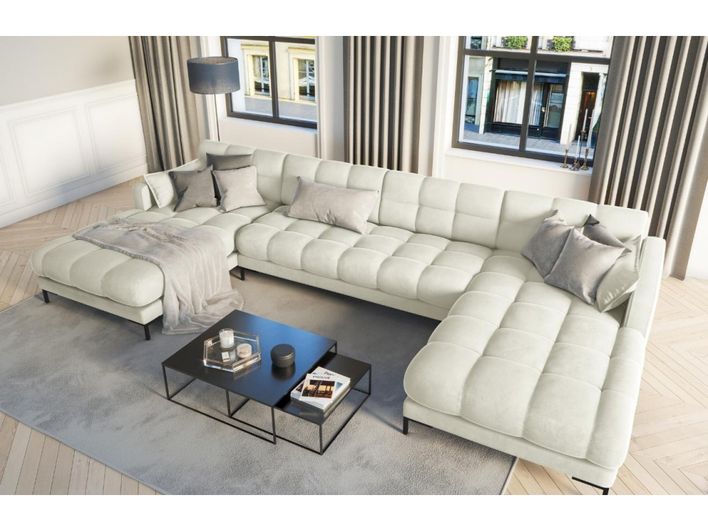 Elegantní šestimístná rohová pohovka MICADONI MAMAIA zaujme na první pohled svým nadýchaným vzhledem. Velmi příjemné sametové čalounění v krémově bílé barvě a kovová podnož vytváří kontrast, který interiéru dodá elegantní vzhled a nádech luxusu. Díky zajímavému prošívání vzniká jemný design, který do vašeho domova vnese lehkost a styl. Opěrné polštářky zvednou úroveň vašeho odpočinku o stupeň výš. Díky praktickému tvaru do písmene U získáte rovnoměrně rozdělená místa k odpočinku. Nechte se obklopit komfortem ve společnosti produktů Mamaia.