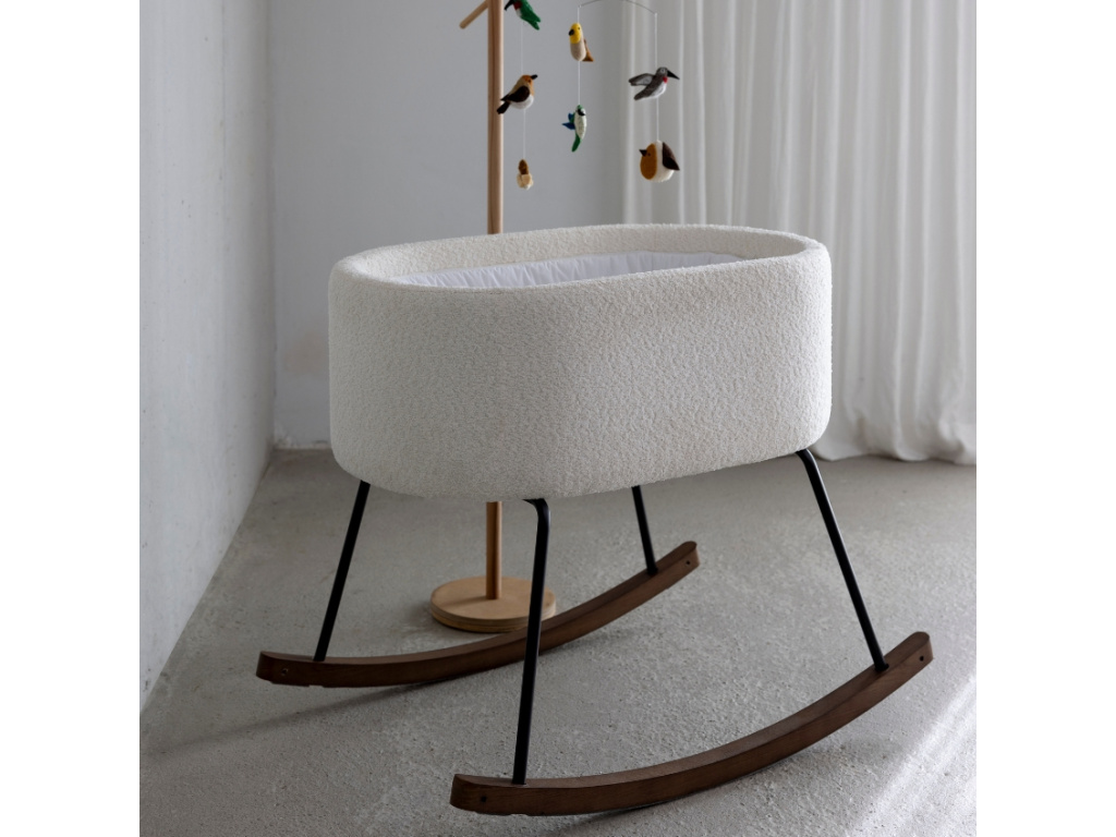 Houpací kolébka Quax De Luxe pomůže zavést vaše děťátko do klidné říše snů. Je čalouněná měkkou bouclé tkaninou, pohodlnou a příjemnou na dotek. Minimalistický design kolébkového hnízdečka je doplněn kovovou podnoží a dřevěnými ližinami z březového masivu. Ty jsou na spodní straně opatřeny plstěným materiálem, který ochrání podlahu před poškrábáním a usnadní hladký pohyb. Díky odnímatelnému vnitřnímu povlaku se nemusíte bát o zdraví vašeho miminka, stačí ho vyprat a znovu použít. Vytvořte vašemu drobečkovi bezpečné a klidné útočiště s kolébkou De Luxe v nadčasovém designu. Součástí balení jsou také čtyři kovové zarážky, které využijete, když nebudete chtít, aby se kolébka hýbala.