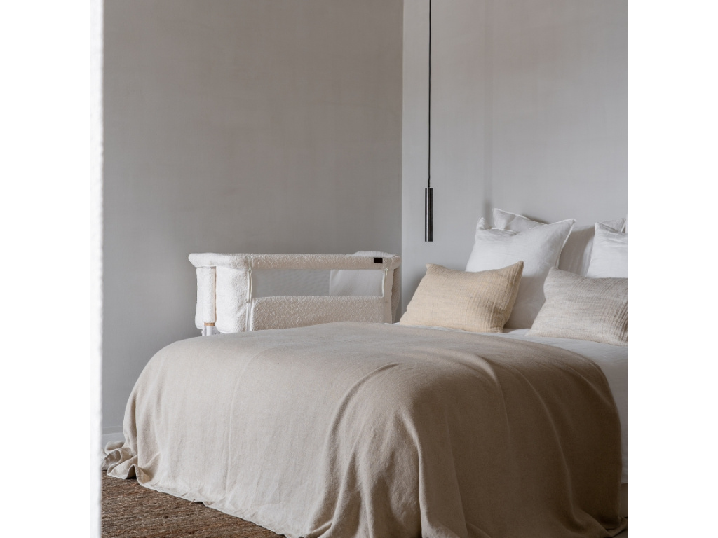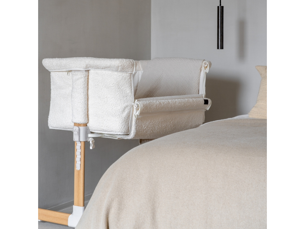 Pro první měsíce života všeho miminka je praktická postýlka Quax Side by Side jako stvořená. Bude ideálním společníkem, pokud ji budete chtít umístit vedle postele a mít tak děťátko stále u sebe. Díky čtyřem kolečkům na podnoži se s ní snadno manipuluje. Postýlka se pyšní měkoučkým bouclé potahem, který lze v případě potřeby jednoduše sundat a vyprat. Na něm najdete část na zip, kterou lze odepnout a vy tak budete mít k ratolesti blíže. Díky průsvitné síťce na děťátko také snadno dohlédnete. Postýlka má nastavitelnou výšku a v případě, že miminko trpí refluxem, ji můžete na jedné straně jednoduše zvýšit. Součástí postýlky je také měkká matrace o velikosti 84 x 50 cm. Tato postýlka je výjimečně všestranná a přizpůsobivá a skvěle zapadne i do menších prostor. Hliníková podnož je v krásném designu dřeva.