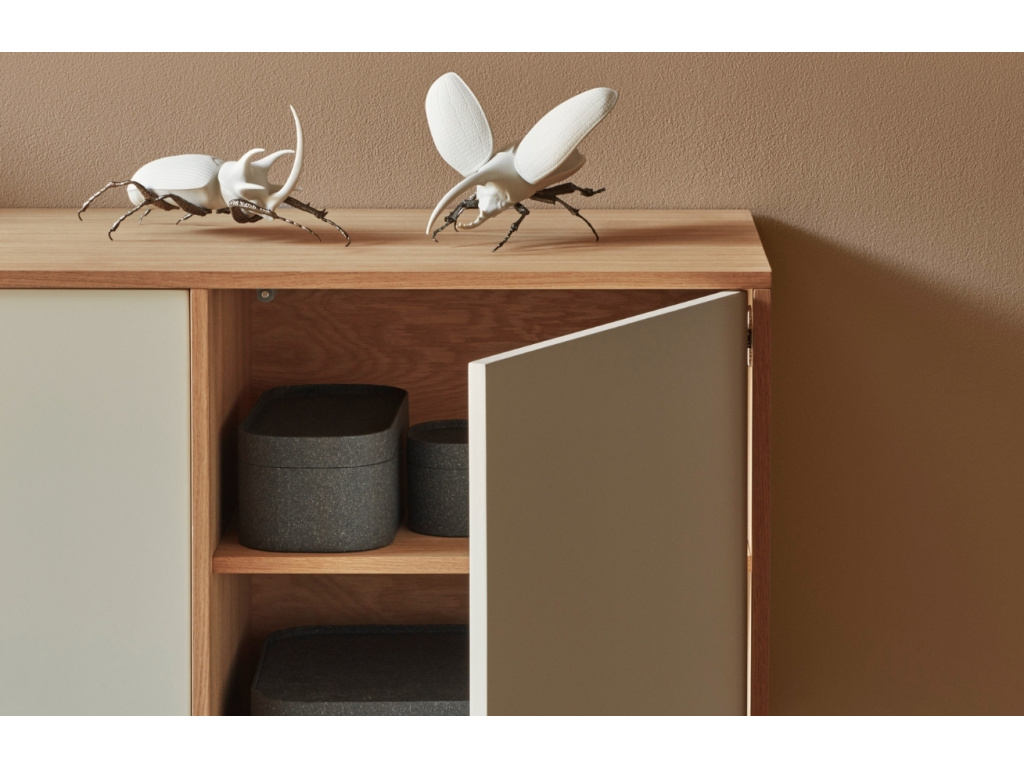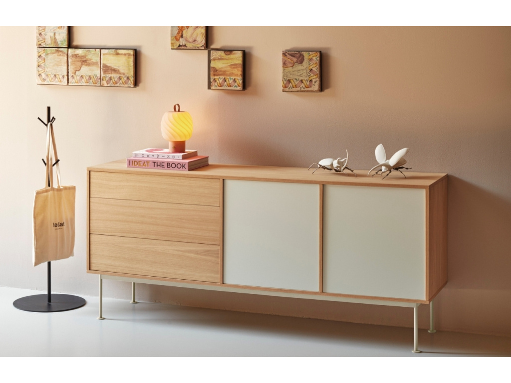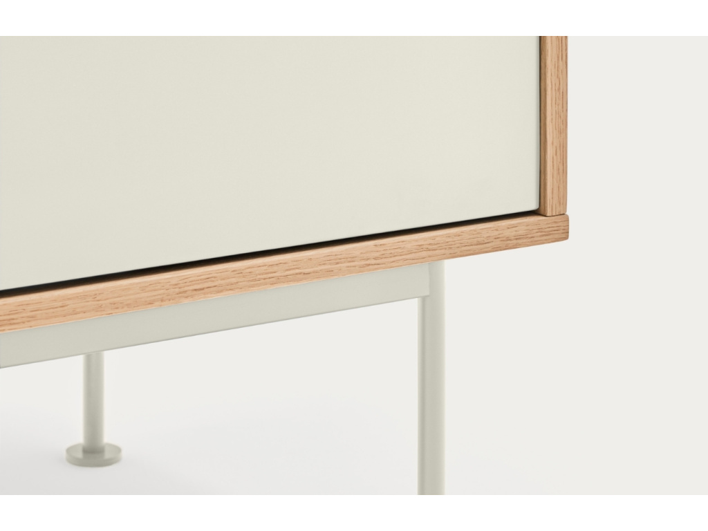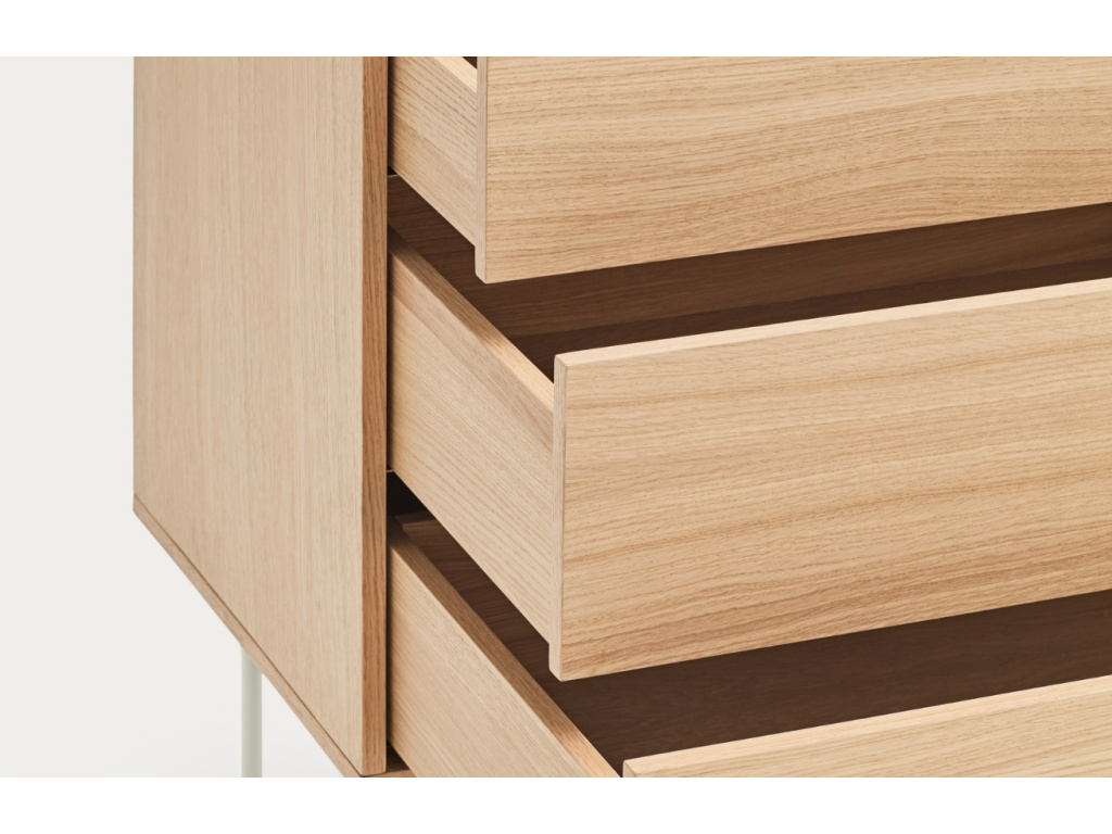 Stylová komoda Teulat Yoko zaujme na první pohled svým neobyčejným designem. Kombinace korpusu z dubové dýhy, dvířek z lakované MDF v krémově bílé barvě a kovové podnože ve stejné barvě vnese do vašeho interiéru moderní a trendy prvek. Komoda disponuje 4 uzavřenými policemi a 3 prostornými zásuvkami, které vytváří praktické a prostorné úložiště, kam pohodlně uložíte váš inventář. Komoda se skvěle hodí do moderních interiérů. Doporučujeme kombinovat s dalšími produkty z řady Yoko.