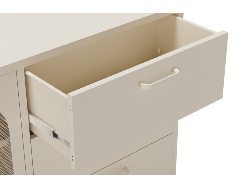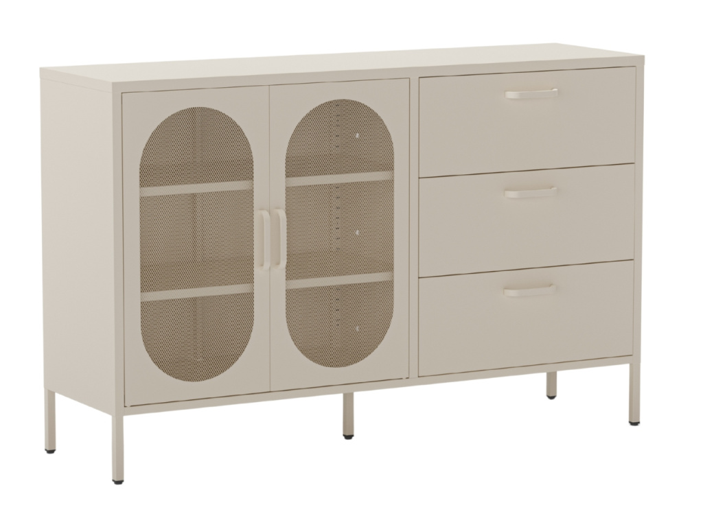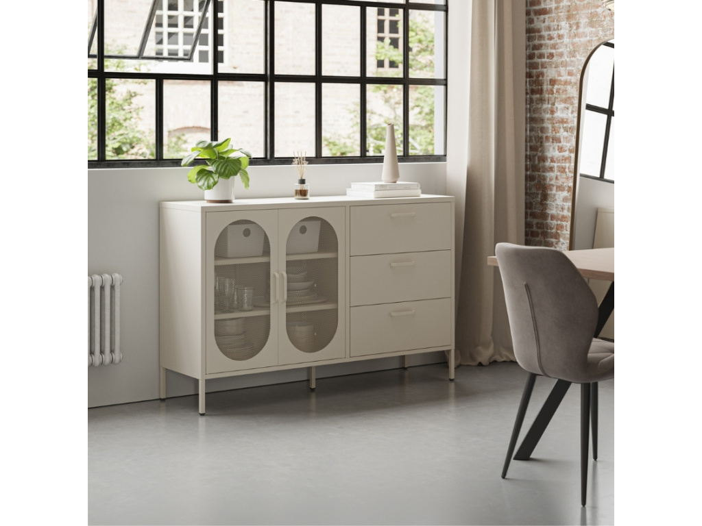 Celokovová komoda Diora zaujme elegantním krémově bílým odstínem a industriálním nádechem. Dvojice perforovaných dvířek s obloukovým dekorem dává nahlédnout dovnitř, kde se ukrývají tři praktické police a o další úložný prostor se postarají tři prostorné zásuvky. Komoda skvěle vynikne v industriálním, eklektickém nebo minimalistickém interiéru. Kolekce Diora nabízí také TV stolky, noční stolky a komody v pěti trendy odstínech.