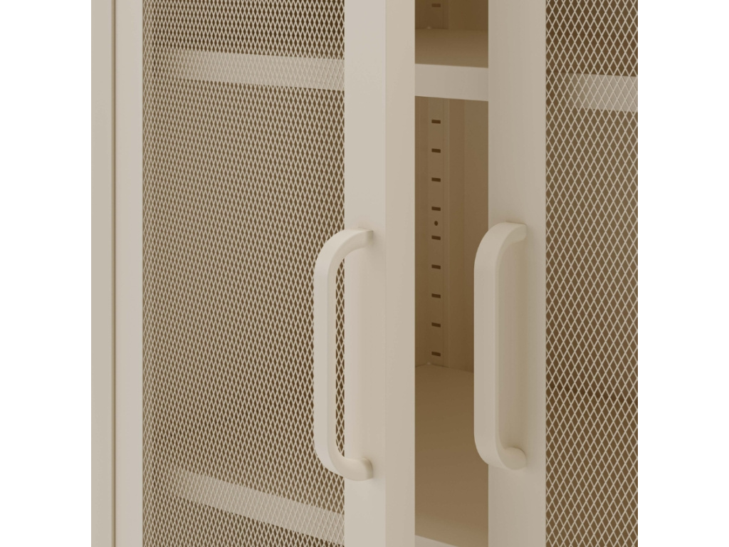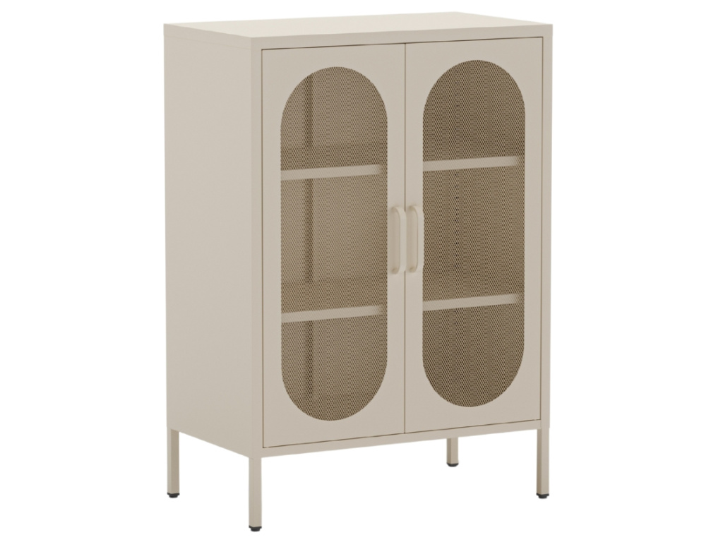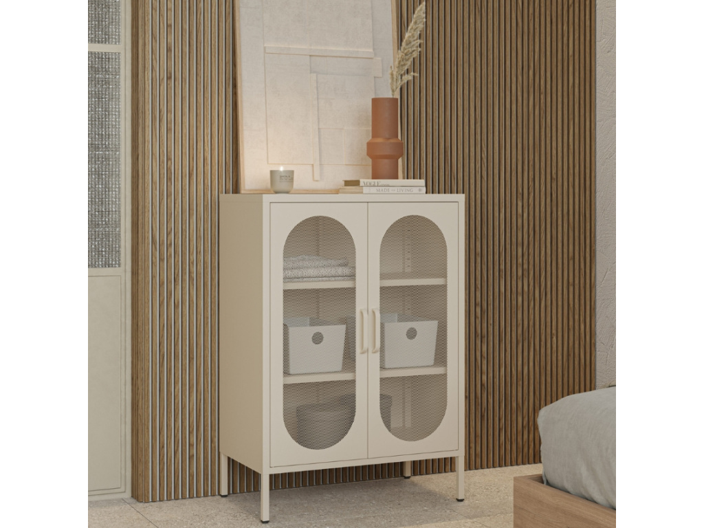 Celokovová komoda Diora zaujme elegantním krémově bílým odstínem a štíhlými proporcemi. Dvojice perforovaných dvířek s obloukovým dekorem dává nahlédnout dovnitř, kde se ukrývají tři praktické police. Komoda skvěle vynikne v industriálním, eklektickém nebo minimalistickém interiéru. Kolekce Diora nabízí také TV stolky, noční stolky a komody v pěti trendy odstínech – který bude pro vás ten pravý?