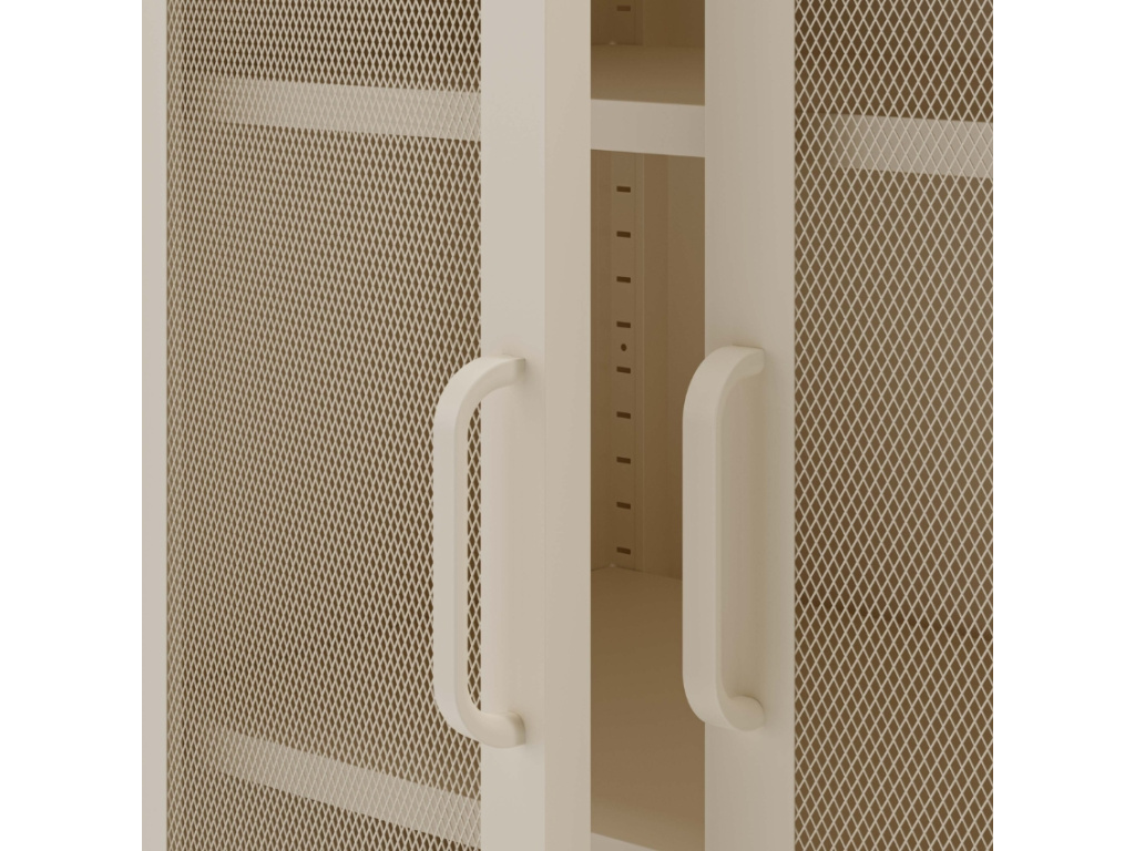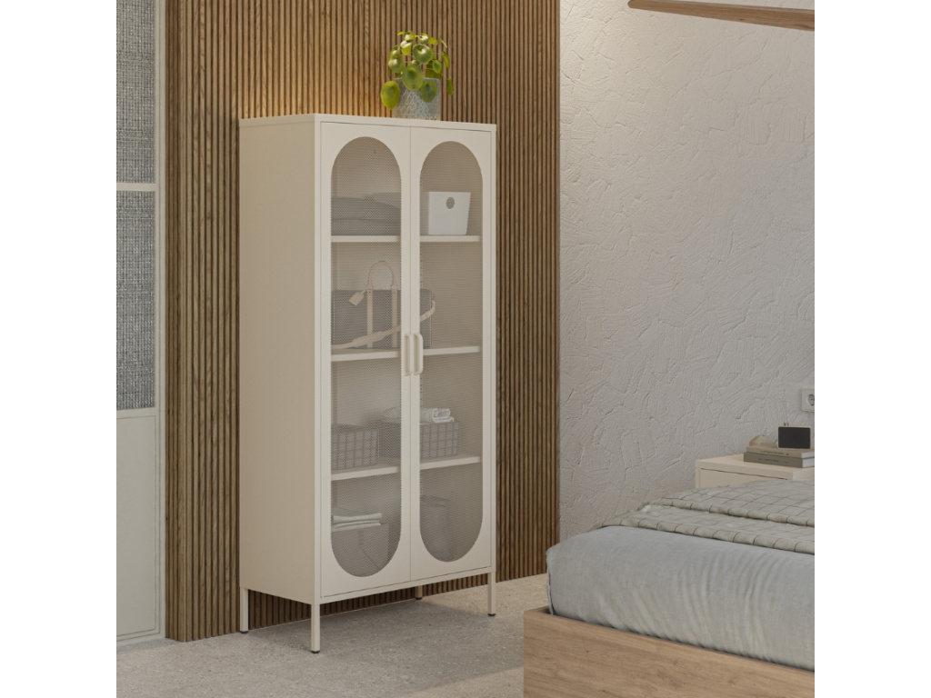 Celokovová skříň Diora zaujme elegantním krémově bílým odstínem a štíhlými proporcemi. Dvojice perforovaných dvířek s obloukovým dekorem dává nahlédnout dovnitř, kde se ukrývají čtyři praktické police. Skříň skvěle vynikne v industriálním, eklektickém nebo minimalistickém interiéru. Kolekce Diora nabízí také TV stolky, noční stolky a komody v pěti trendy odstínech – který bude pro vás ten pravý?