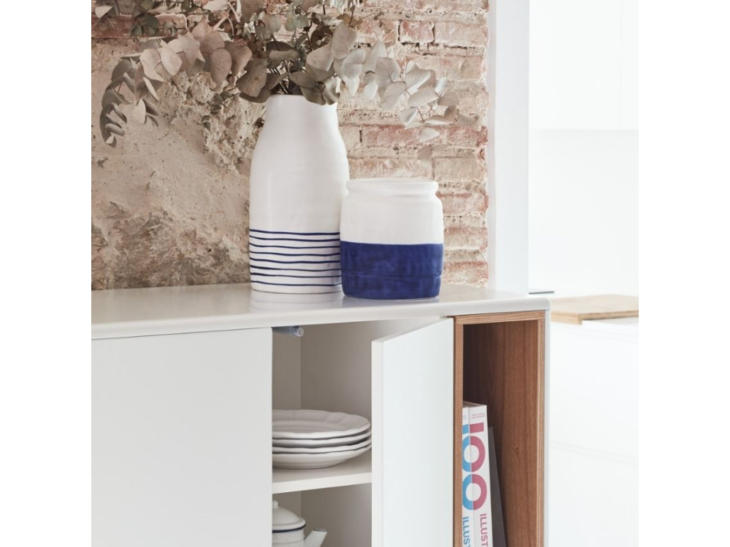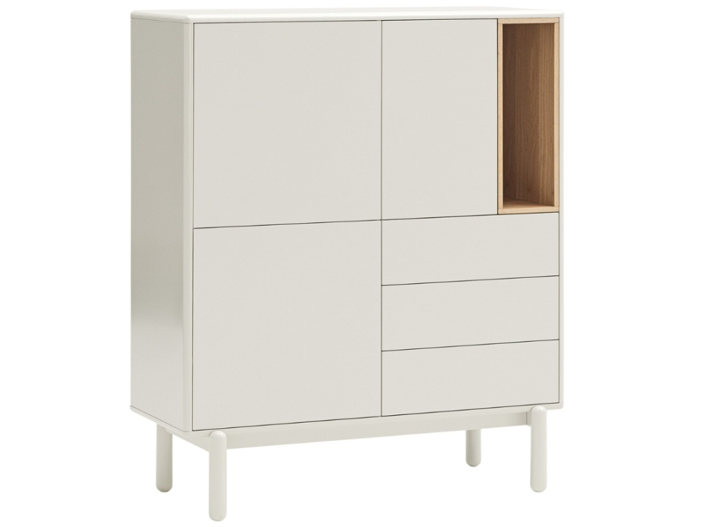 Komoda Teulat Corvo v zajímavé krémově bílé barvě vás na první pohled zaujme svým minimalistickým designem a různorodě řešeným a velkým úložným prostorem. Korpus komody je z lakovaného MDF, které si oblíbíte pro snadnou údržbu. Úložný prostor se skládá z několika polic za uzavíratelnými dvířky a tří vysouvacích zásuvek. Monotónní barva komody je zpestřena jednou kontrastní policí s dubovou dýhou. Bytelná podnož je z masivního dřeva.