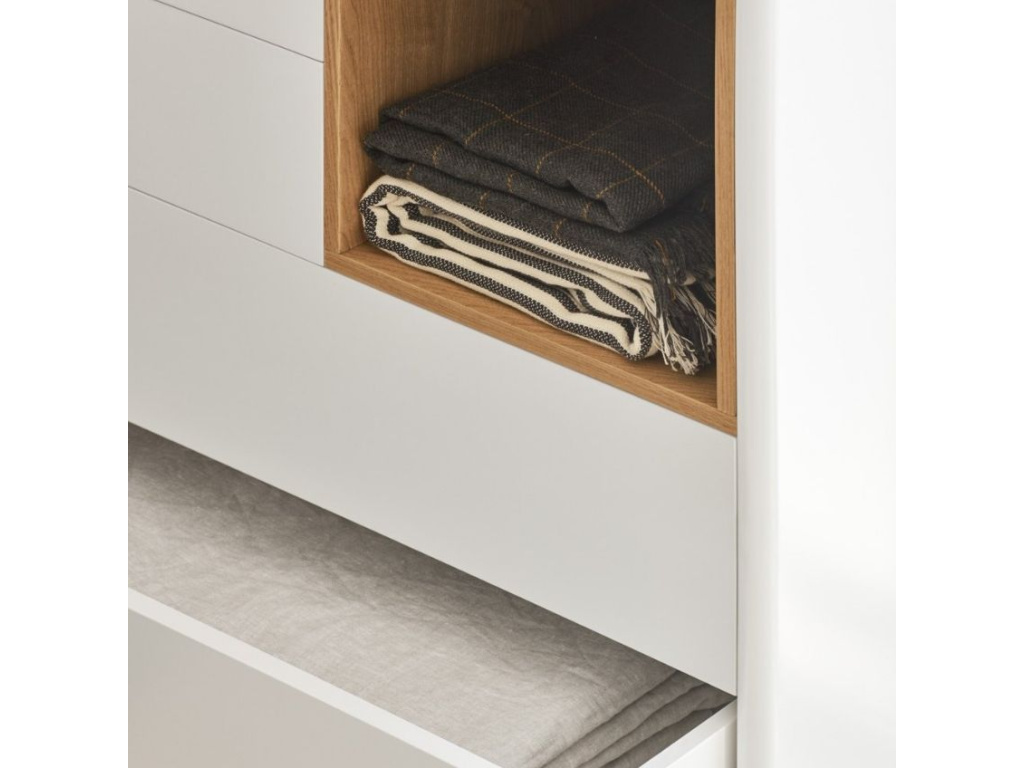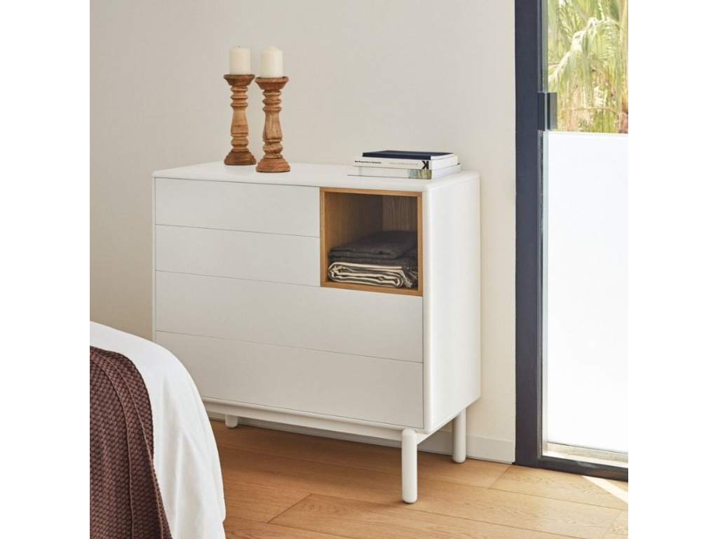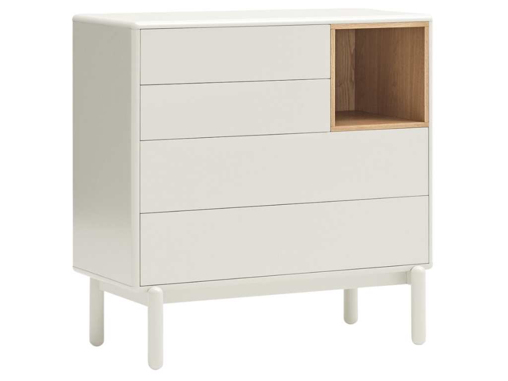 Komoda Teulat Corvo v elegantní krémové barvě vás na první pohled zaujme svým minimalistickým designem a efektivně řešeným úložným prostorem. Korpus komody je z lakovaného MDF, které si oblíbíte pro snadnou údržbu. Úložný prostor se skládá ze čtyř vysouvacích zásuvek. Monotónní barva komody je zpestřena jednou kontrastní policí s dubovou dýhou. Bytelná podnož je z masivního dřeva.
