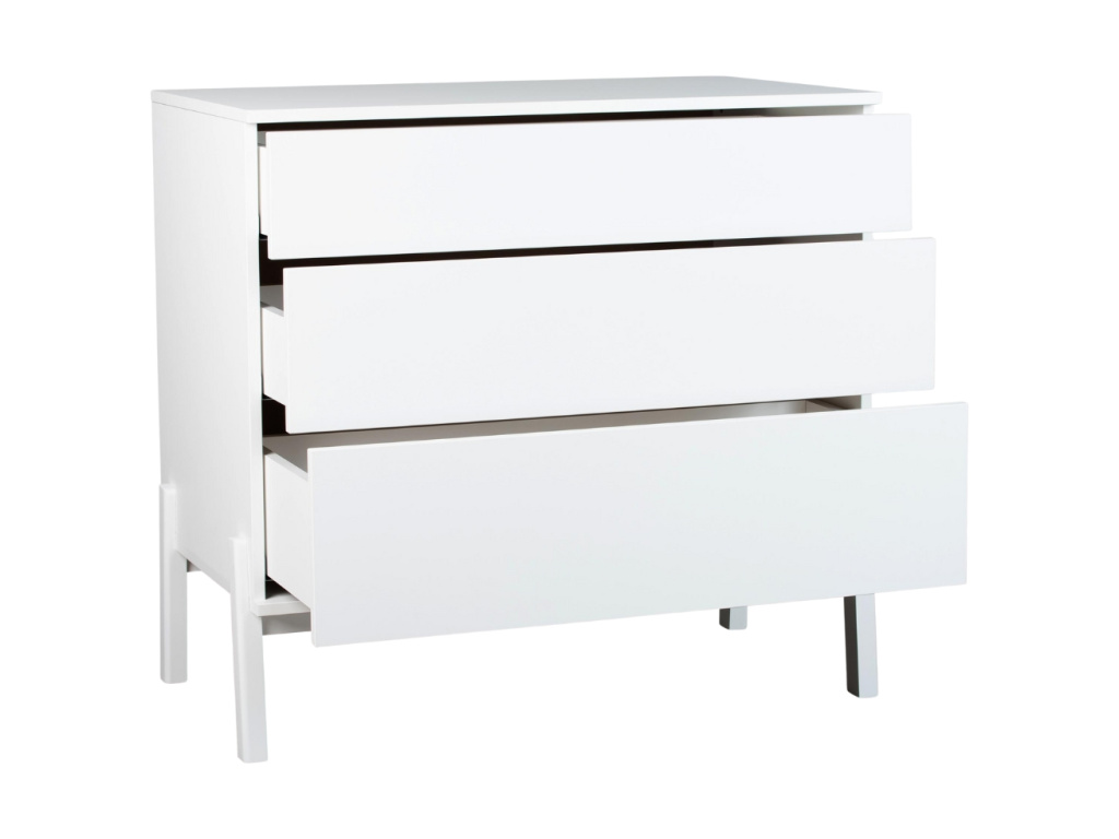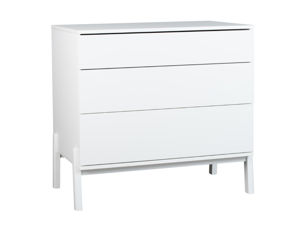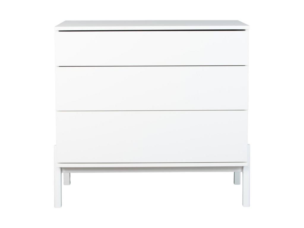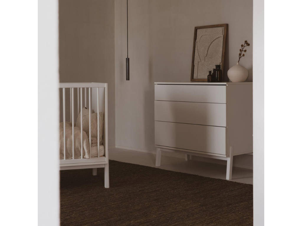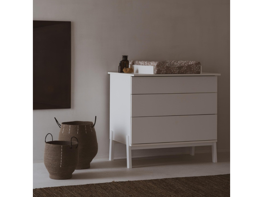 Komoda Ashi představuje vytříbený styl a pyšní se jak estetickou, tak praktickou funkcí. Minimalistickou konstrukci, vyrobenou z laminované dřevotřísky, doplňuje masivní podnož z bukového dřeva. Tři praktické zásuvky skvěle poslouží jako úložný prostor například na oblečení, hračky či přebalovací doplňky. Volné místo na komodě lze pak využít na různé dekorace, nebo doplnit o přebalovací nástavbu od značky Quax a rázem tak získat přebalovací pult.