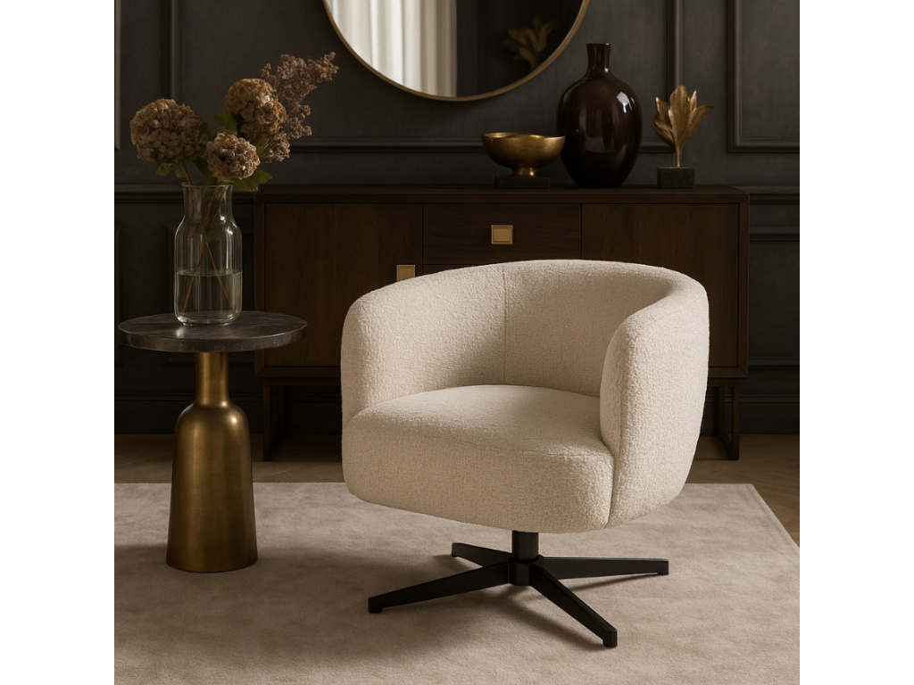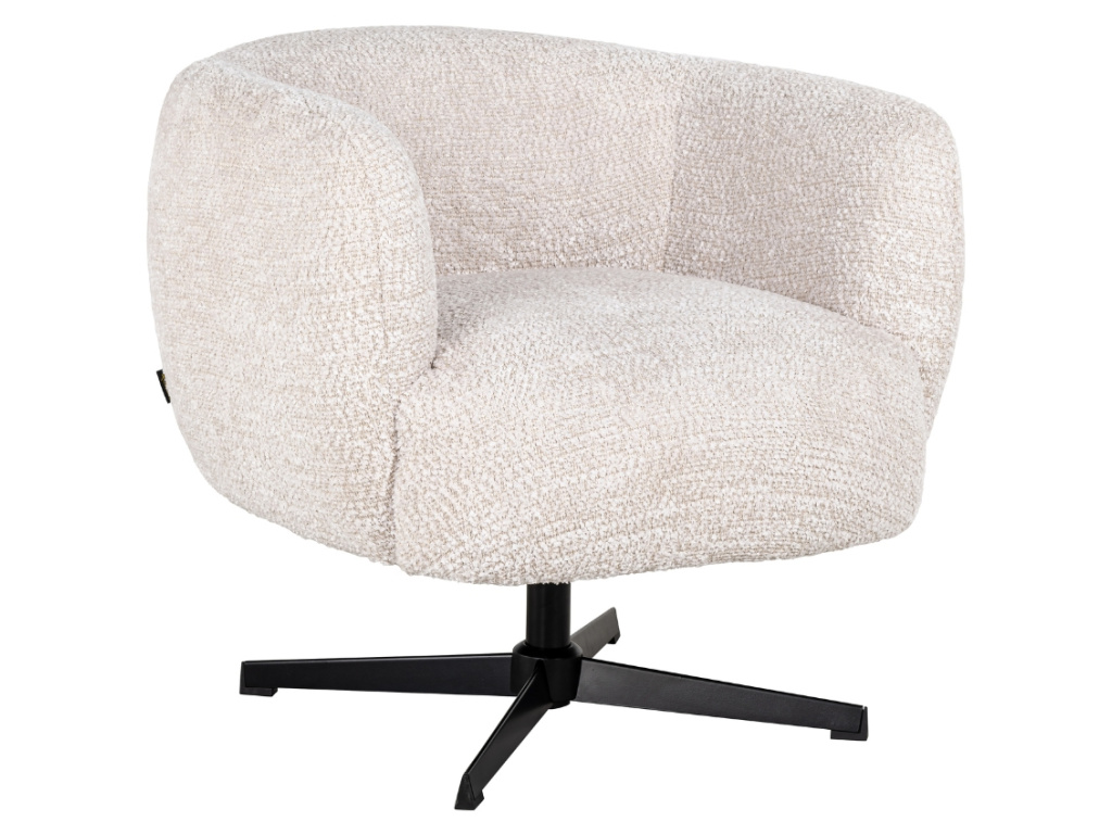 Krémově bílé čalouněné křeslo Estelle od značky Richmond bude pohodlným doplňkem vaší odpočinkové zóny. Černě lakovaná kovová podnož se postará o otočnou funkci, se kterou se můžete snadno natočit potřebným směrem bez nutnosti křeslo odsouvat. Do interiéru přinese útulný designový prvek a zároveň praktický kus nábytku. Křeslo si můžete vybrat ze dvou barevných provedení.