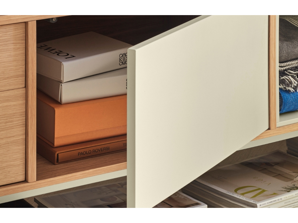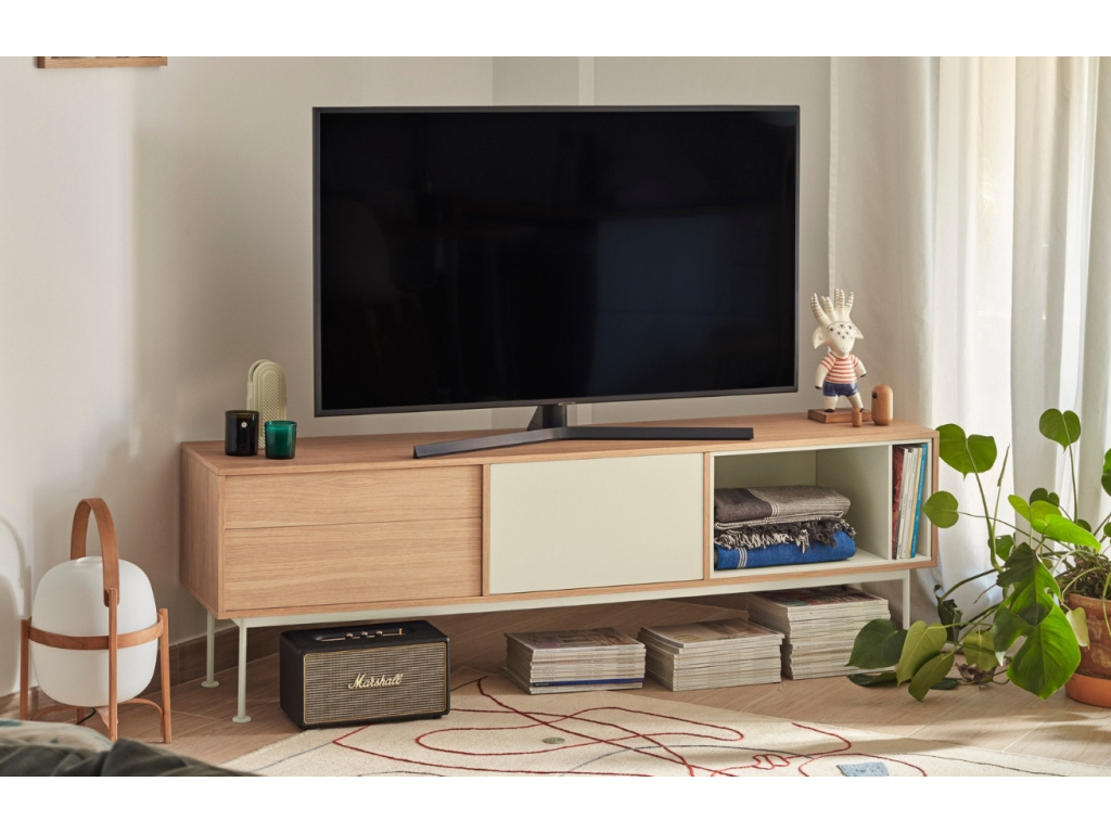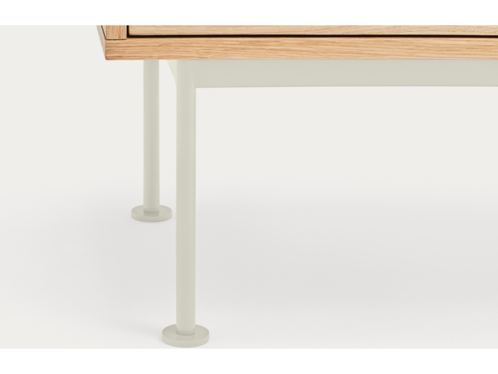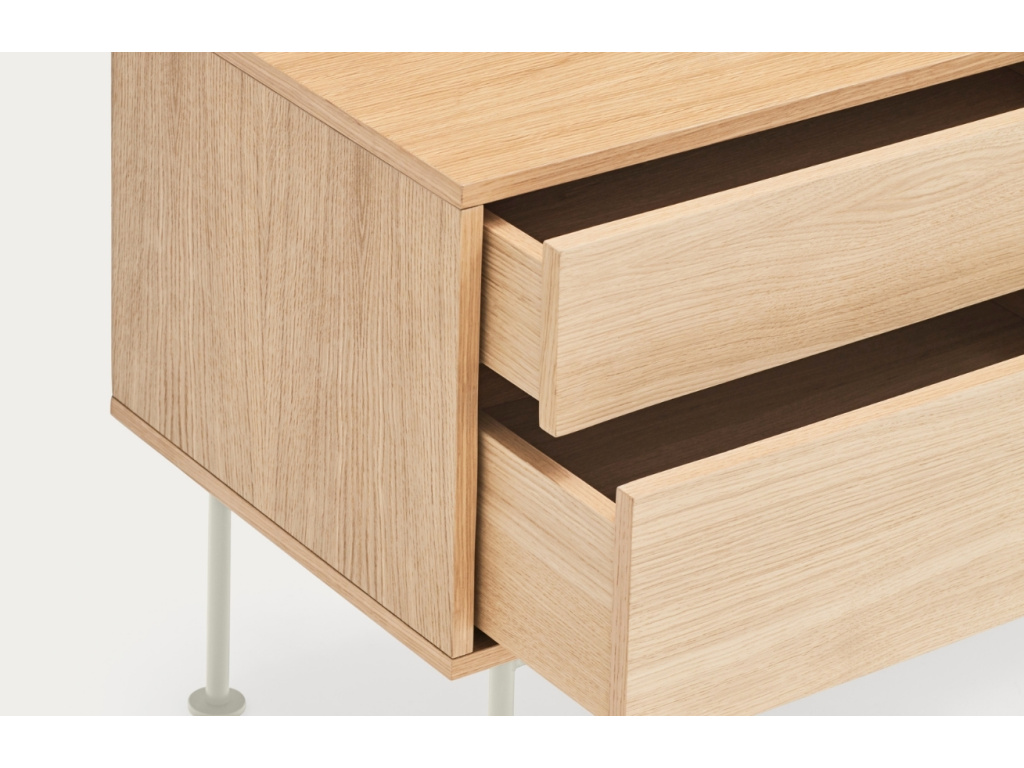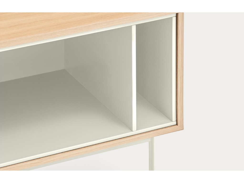 Stylový TV stolek Teulat Yoko zaujme na první pohled svým neobyčejným designem. Kombinace korpusu z dubové dýhy, dvířek z lakované MDF v krémově bílé barvě a kovové podnože ve stejné barvě vnese do vašeho interiéru moderní a trendy prvek. Stolek disponuje 2 otevřenými a 1 uzavřenou policí a 2 prostornými zásuvkami, které vytváří praktické a prostorné úložiště, kam pohodlně uložíte váš inventář. Stolek se skvěle hodí do moderních interiérů. Doporučujeme kombinovat s dalšími produkty z řady Yoko.