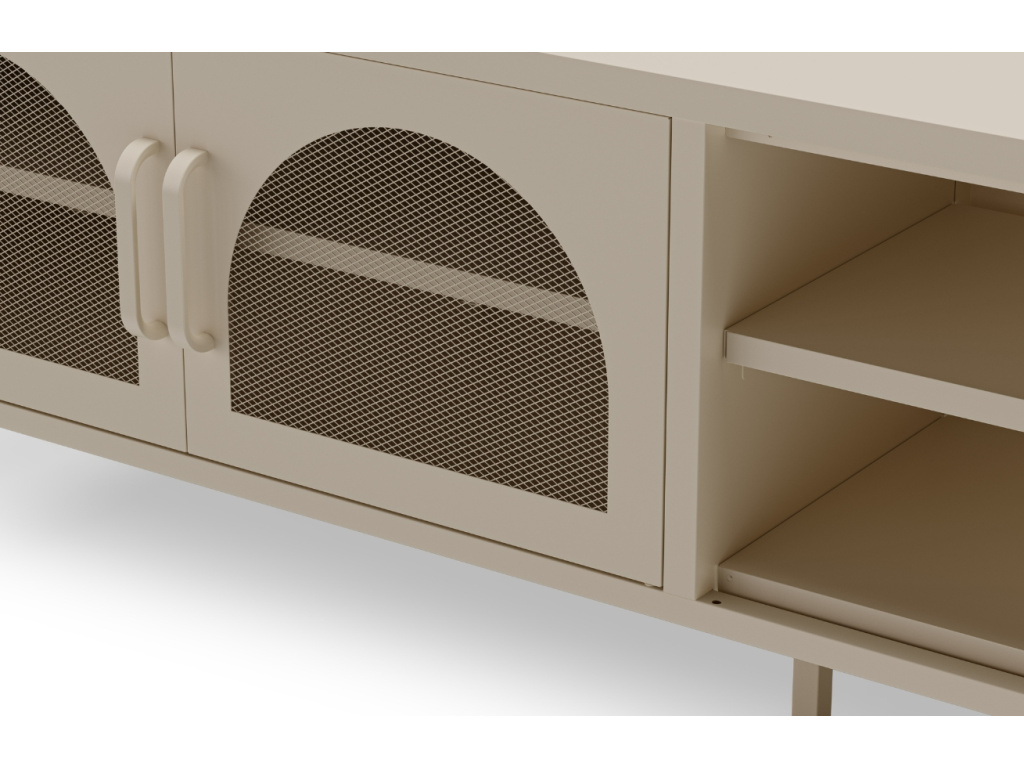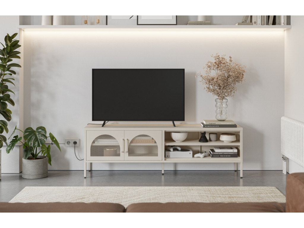 TV stolek Diora je vyroben z práškově lakovaného kovu v krémově bílém odstínu. Kovová dvířka se zaobleným perforovaným dekorem ukrývají praktický úložný prostor, další místo nabízejí dvě otevřené police. Díky své neutrální, nadčasové barvě a industriálnímu charakteru vynikne v retro i minimalistických interiérech. Kolekce Diora zahrnuje i noční stolky, komody a skříně v pěti stylových odstínech.