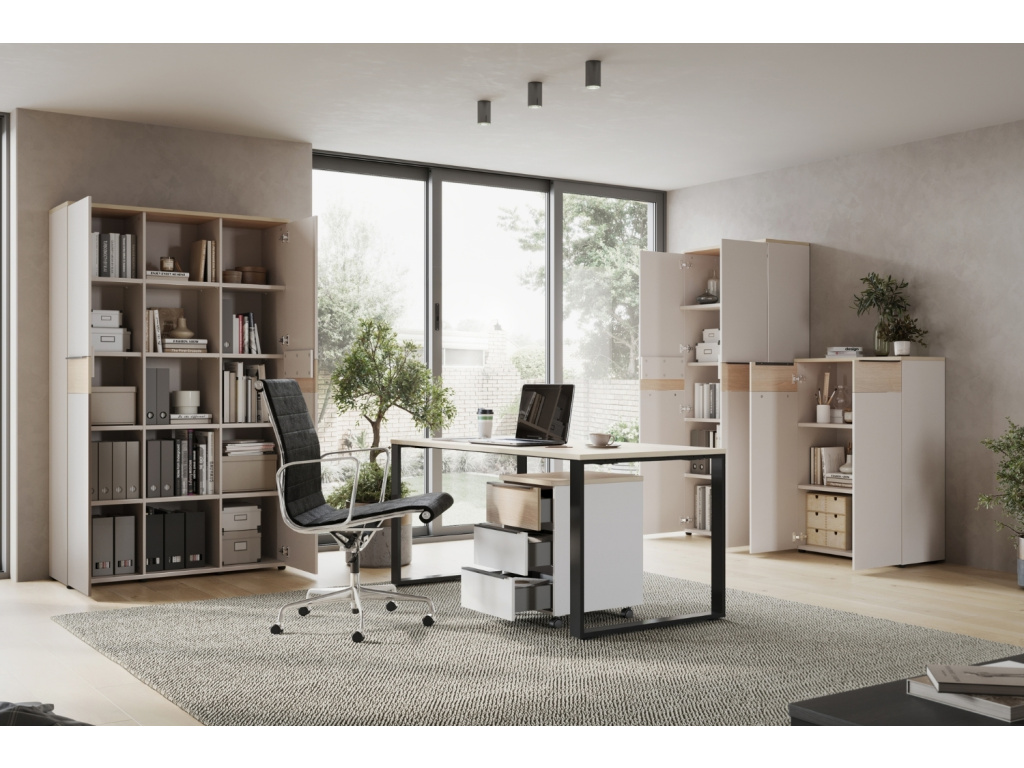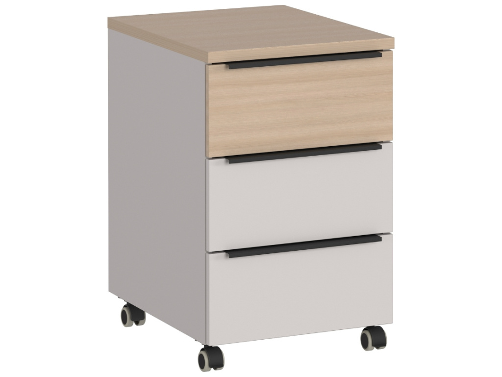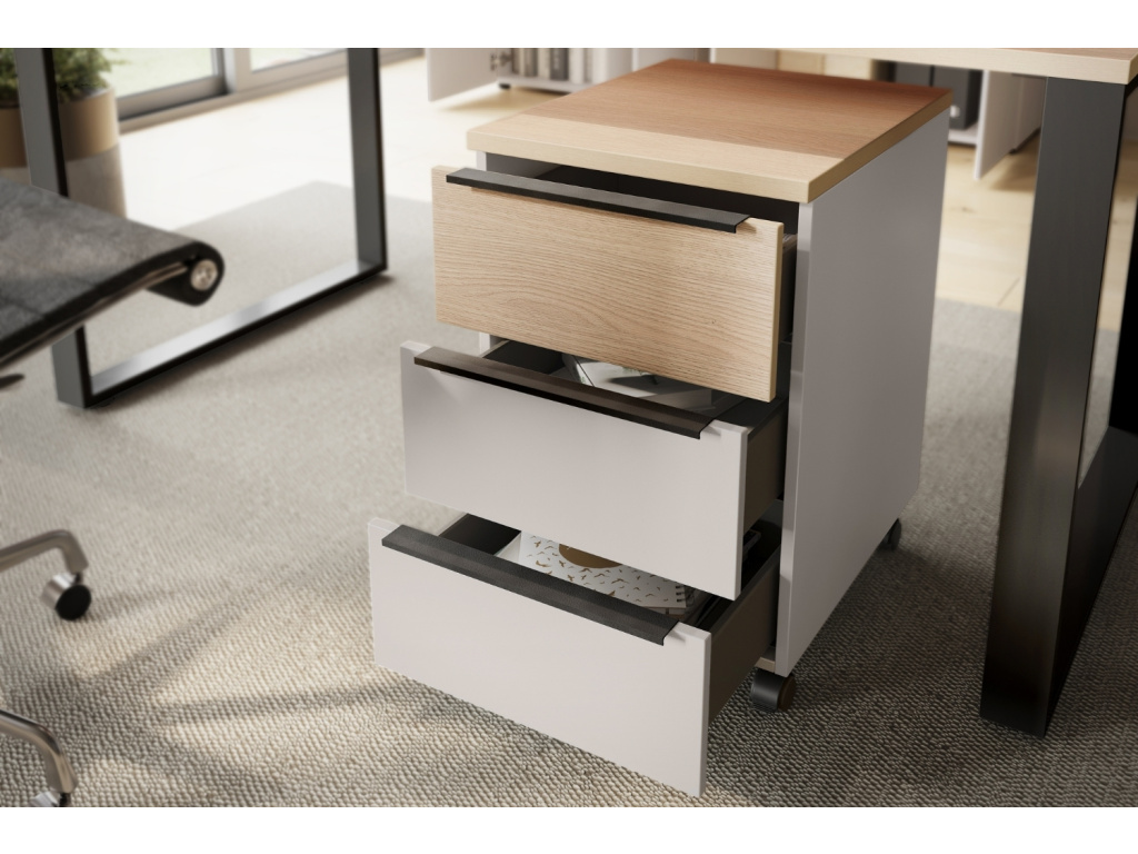Pojízdný kontejner Oviedo od značky Germania vnese do pracovního prostoru řád, styl i praktičnost v dokonale vyváženém poměru. Jeho krémově bílé provedení v kombinaci s přírodním dubem Lindberg působí svěže a elegantně, takže se skvěle hodí do moderní kanceláře i domácí pracovny. Za jeho kompaktním vzhledem se skrývá promyšlená funkčnost. Zásuvky s funkcí tlumeného a samočinného dovírání se zavírají tiše, plynule a s pocitem luxusu. Nabízejí dostatek prostoru pro dokumenty, kancelářské potřeby i drobnosti, které chcete mít vždy po ruce. Povrch z odolné melaminové pryskyřice chrání kontejner před poškrábáním a vlhkostí, zatímco kvalitní ABS hrany zaručují dlouhou životnost a precizní vzhled i při každodenním používání. Oviedo je víc než jen úložný prvek – je to stylový a spolehlivý společník, který kombinuje preciznost, dlouhou životnost a estetiku, jenž do pracovního prostředí přinese klid, přehled i špetku luxusu.
