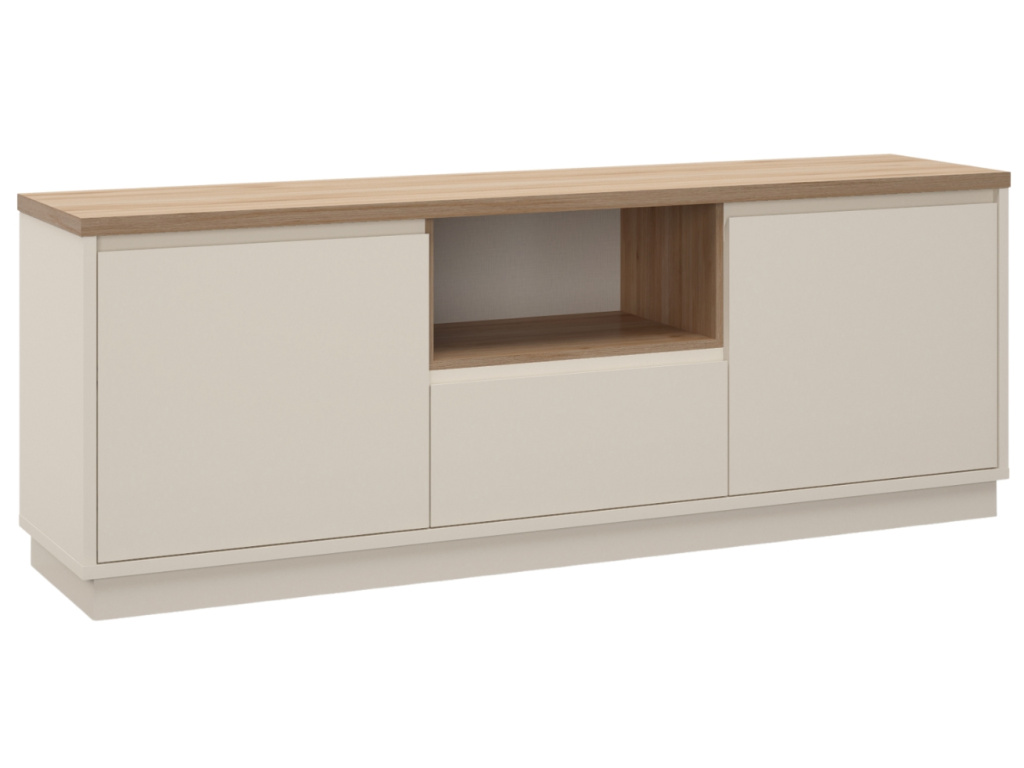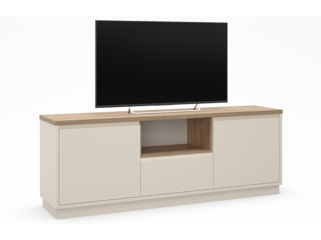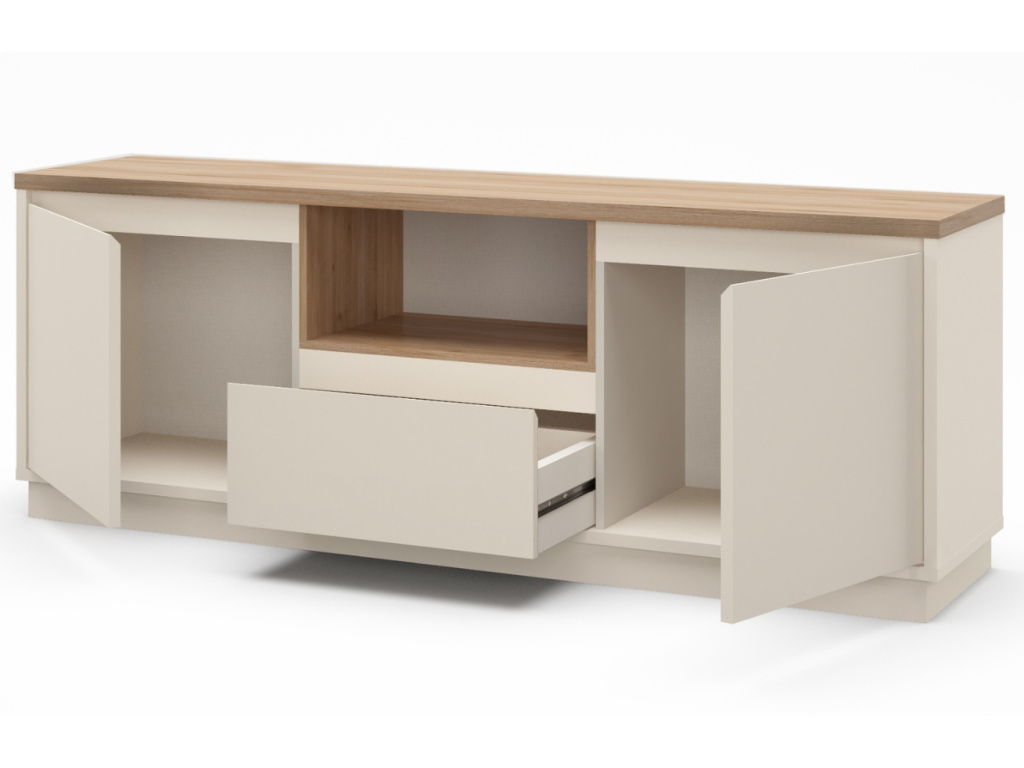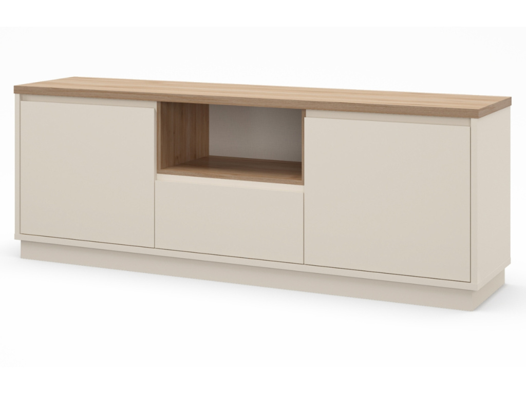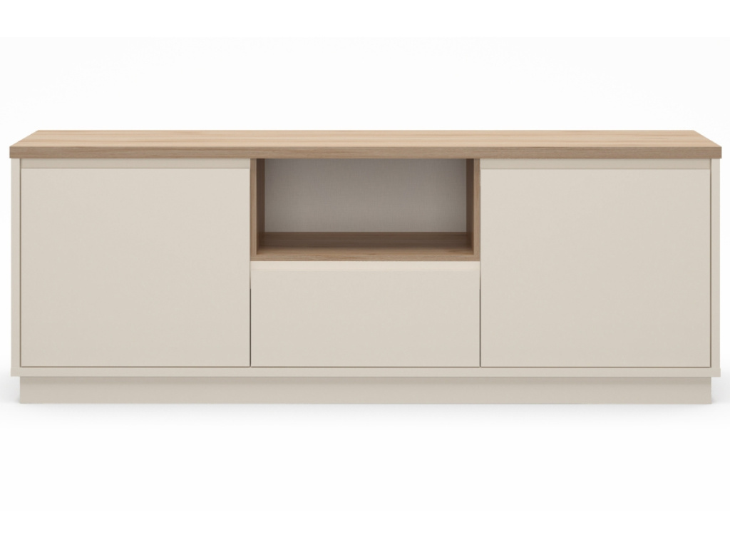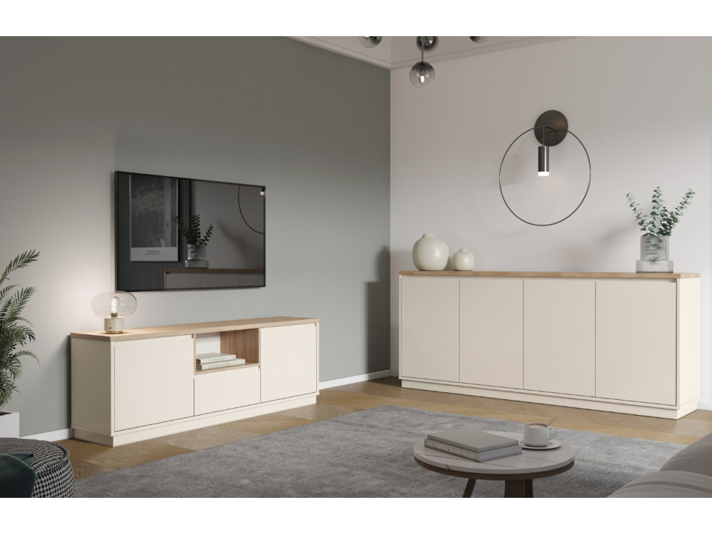 TV stolek Loreta přinese do vašeho interiéru klid, harmonii a lehkost. Kombinace krémového matu a dekora dubu vytváří přirozeně teplý dojem, který vynikne zejména v interiérech laděných do skandinávského, přírodního nebo japandi stylu. Laminovaný povrch je praktický na údržbu a odolný vůči každodennímu používání. Díky chytrému rozvržení s otevřenou policí a uzavřeným úložným prostorem nabízí funkční zázemí pro elektroniku i drobnosti. Kolekce Loreta zahrnuje také dvě komody ve stejném designu, které s TV stolkem vytvoří dokonale sladěný celek.