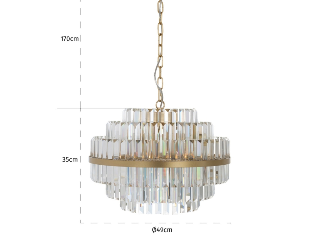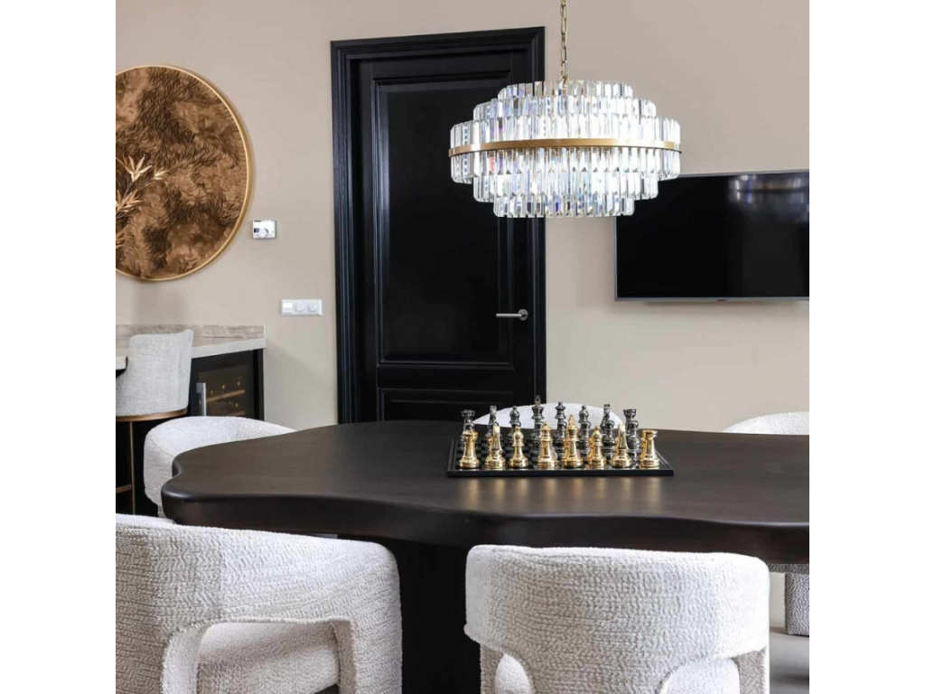 Křišťálový lustr Desire od značky Richmond bude luxusním doplňkem nejen v domácnosti, ale i v hotelovém salonku nebo baru. Je vyroben z těch nejkvalitnějších materiálů a zaručeně se stane předmětem konverzace. Zlatě lakovaný kovový baldachýn je obklopen křišťálovým stínidlem, které se postará o rovnoměrné osvětlení celého interiéru. Lustr Desire je nadčasovým kusem osvětlení a dodá vašemu interiéru nádech elegance a luxusu.