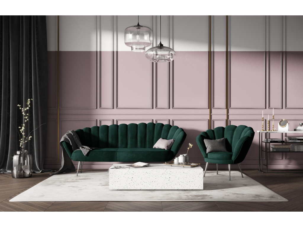 Třímístná pohovka Kingston značky Cosmopolitan Design se vyznačuje jemným prošíváním, které jí dodává elegantní a vzdušný vzhled. Její jemně lesklé sametové čalounění v lahvově zeleném odstínu je hebké a příjemné na dotek. Tkanina je velmi odolná proti oděru a absorpci tekutin, čímž zaručí dlouhodobé používání bez známek opotřebení. Celkový design pohovky doplňuje stříbrná kovová podnož. Pro dokonale sladěný sedací kout doporučujeme doplnit pohovku o křeslo ze stejnojmenné série. Všechny produkty nabízíme v sedmi barevných provedeních. Užijte si pohodlí a styl v jednom!