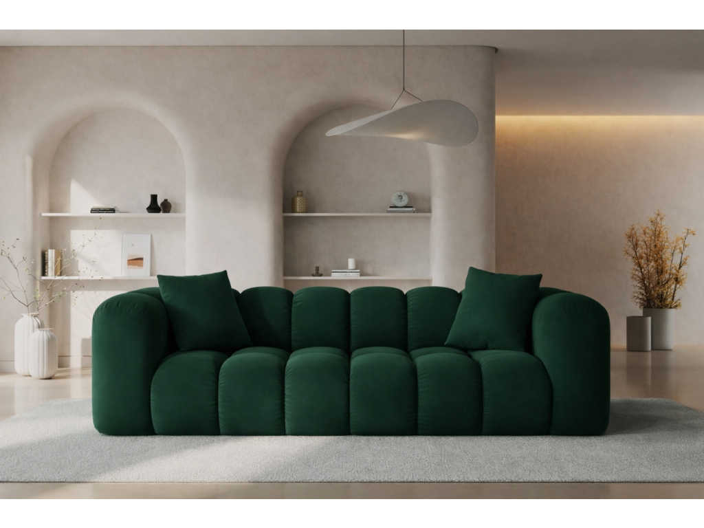 Velkolepá třímístná pohovka Halley od značky Windsor & Co zaujme charakteristickým prošíváním. Bublinkové sedáky, opěradla a područky vybízejí k nespoutané relaxaci. Pohovka je čalouněná sametovou látkou s jemným leskem v lahvově zeleném provedení, která je měkká a velice příjemná na dotek. Tkanina je velmi odolná proti oděru a absorpci tekutin, čímž zaručí dlouhodobé používání bez známek opotřebení. Látka navíc prošla cigaretovým testem, tudíž je odolná proti doutnání a vznícení. Tento skvostný kus nábytku nejen zaujme na první pohled, ale především zútulní váš interiér ve skandinávském nebo glamour stylu. Příjemným bonusem jsou elegantní polštářky, které doladí pohovku k dokonalosti. Pro sjednocení vašeho sedacího koutu doporučujeme pohovku doplnit také o podnožkou ze stejnojmenné série. Všechny produkty nabízíme v několika barvách. Odpočiňte si a relaxujte ve stylu!