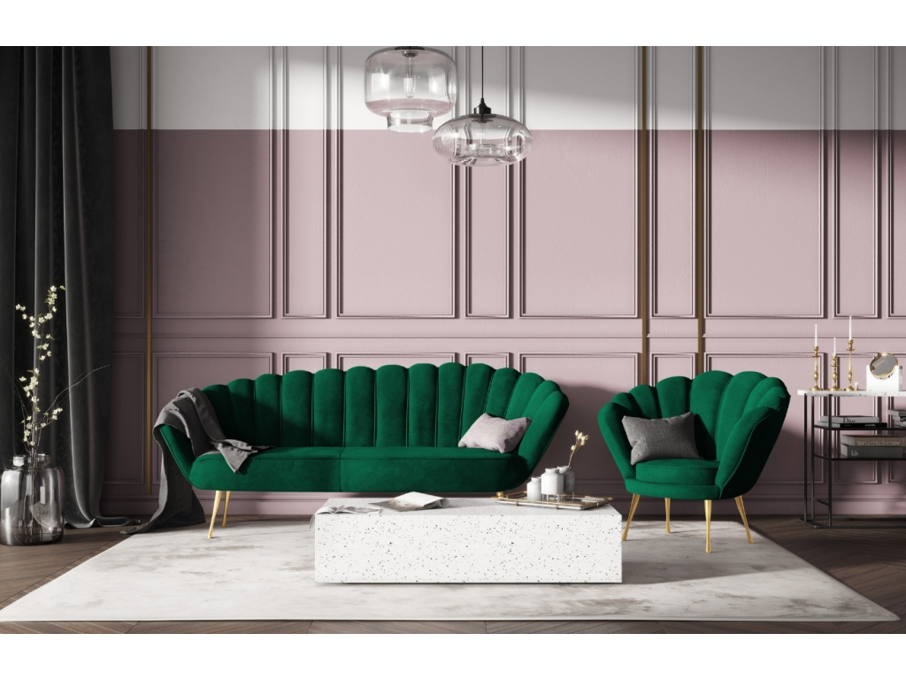 Křeslo Kingston značky Cosmopolitan Design představuje spojení elegance a neotřelého vzhledu. Jeho jemně lesklé sametové čalounění v lahvově zeleném odstínu je hebké a příjemné na dotek. Tkanina je velmi odolná proti oděru a absorpci tekutin, čímž zaručí dlouhodobé používání bez známek opotřebení. Celkový design křesla doplňuje zlatě lakovaná kovová podnož. Pro dokonale sladěný sedací kout doporučujeme křeslo doplnit o pohovku ze stejnojmenné série. Křeslo je dostupné v 11 barevných provedeních, od šedých tónů až po výrazné a pestré barvy. Užijte si pohodlí a styl v jednom!