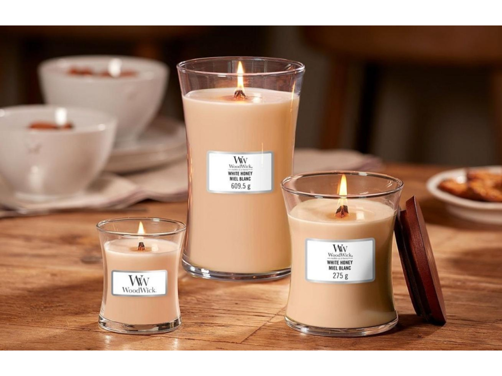Vonná svíčka WoodWick White Honey přináší zážitek dokonalého pohodlí u hořícího krbu díky patentovanému dřevěnému knotu HEARTHWICK, který imituje praskající krb. Vůně sladkého kandovaného pomerančového květu, vanilkové orchideje a pečené karamelové tyčinky vytváří neodolatelnou kombinaci, kterou si rychle zamilujete.