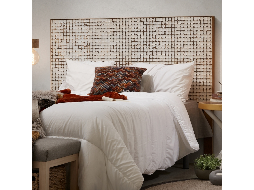 Čelo Kron bude osobitým a dominantním prvkem, který dodá do vaší ložnice příjemnou atmosféru a styl. Čelo má rám a nohy z mangového dřeva a ručně vytvořenou mozaiku z kousků kokosu. Šikovný je i vestavěný nástěnný nástavec pro snadné umístění. S čelem Kron vnesete do vaší ložnice kousek exotiky a léta i v chladných zimních měsících.