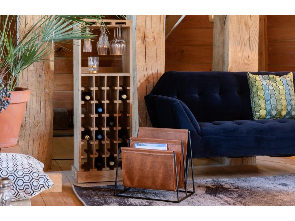 Hnědá komoda Claude vhodná pro co nejstylovější ukládání vašich nejvíce ceněných vín. Úchvatný je úložný prostor z malých překližkových desek pro uložení až 28 lahví vína. Nad již zmíněným úložným prostorem se nachází polička pro umístění dalších lahví vína, dekantérů či vývrtek. Na vnitřní straně horní části komody se nacházejí vyříznuté otvory pro bezpečné vložení skleniček.