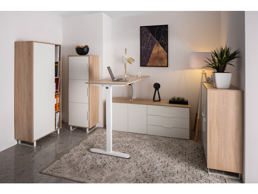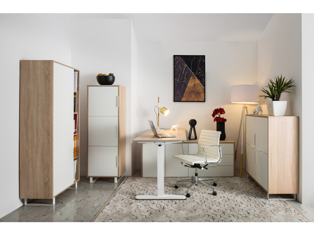 Stylová kancelářská skříň Thor zaujme na první pohled svým designem a praktičností. Celý korpus je vyroben z kvalitního, odolného laminátu, který se skvěle hodí do moderních kanceláří s vysokými nároky na odolnost proti opotřebení. Matně bílá barva a dubový dekor dodávají skříňce osobitost a styl. Kovové úchytky doladí celkový vzhled skříně. Skříň disponuje 3 uzavíratelnými prostornými policemi, a 5 výklenky (neboli nikami), kam pohodlně uložíte veškerý váš inventář. Dolaďte svou kancelář k dokonalosti s produkty Thor. Produkty z této série jsou vyrobeny v tuzemsku a při jejich výrobě byl kladen důraz na kvalitu.
