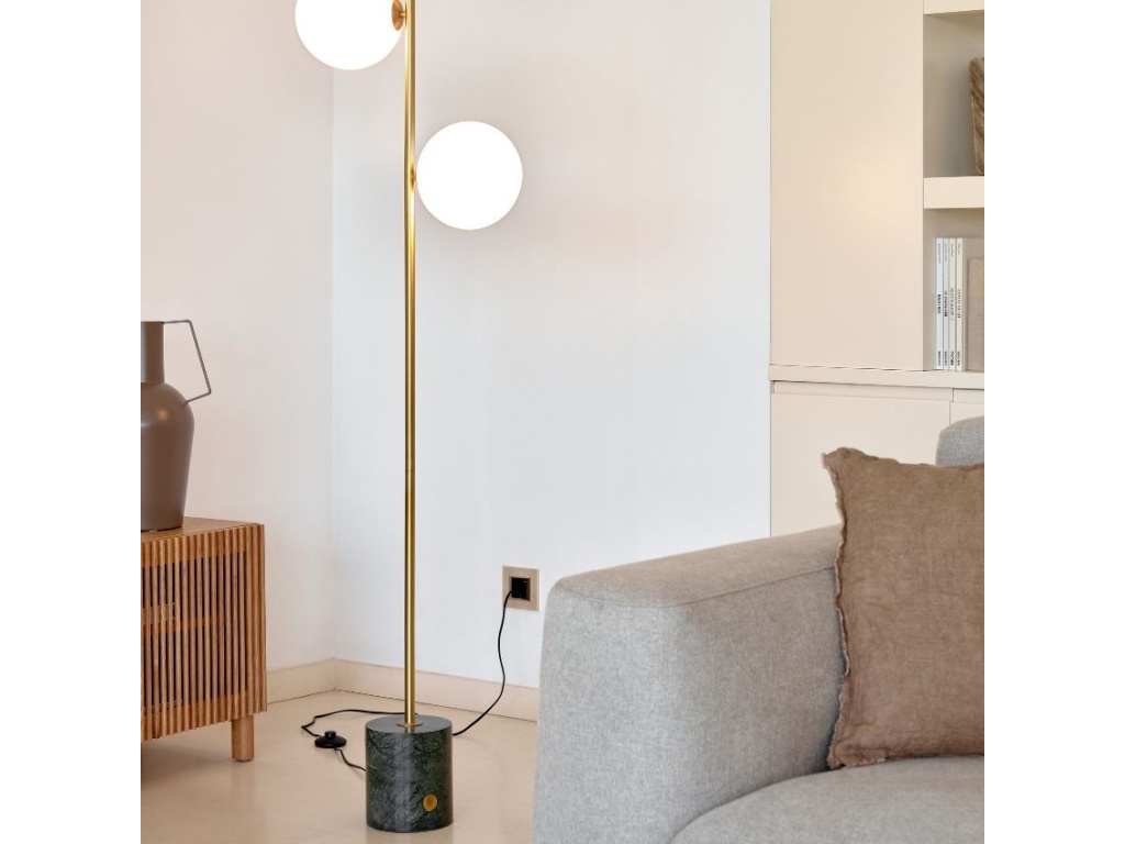 Stojací lampa Kave Home Lonela v sobě velice vkusně kombinuje matně bílá skleněná stínidla a podstavu ze zlatě lakovaného kovu a zeleného mramoru. Právě kombinace barev a použitých materiálů z ní dělá elegantní designový kousek, který rozhodně chcete mít ve svém interiéru. Lampa se perfektně hodí k ozvláštnění obývacího pokoje, ale slušet jí to bude i v předsíni nebo ložnici. Dostupná je také stolní lampa ze stejnojmenné série.