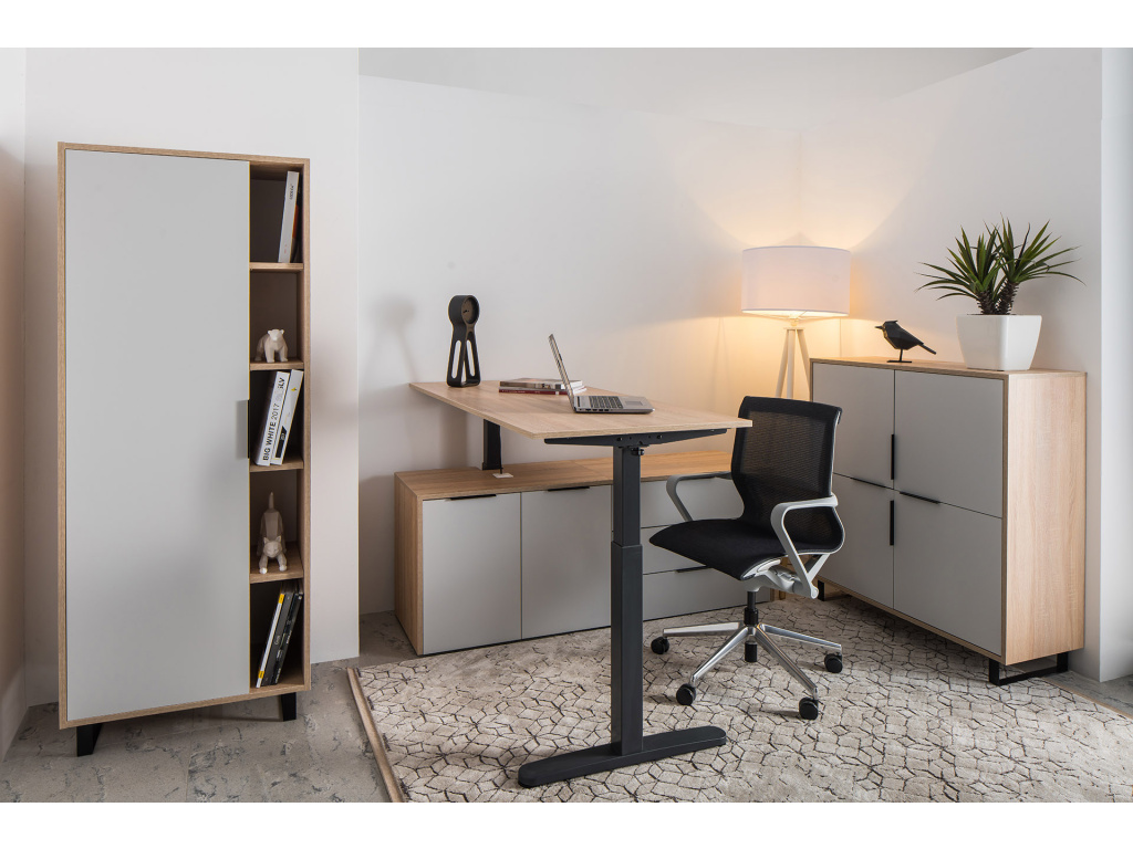 Stylová kancelářská komoda Thor zaujme na první pohled svým designem a praktičností. Celý korpus je vyroben z kvalitního, odolného laminátu, který se skvěle hodí do moderních kanceláří s vysokými nároky na odolnost proti opotřebení. Matně šedá barva a dubový dekor dodávají komodě osobitost a styl. Kovové úchytky doladí celkový vzhled komody. Komoda disponuje 3 prostornými zásuvkami a uzavíratelnou skříňkou s policí, kam pohodlně uložíte veškerý váš inventář. Dolaďte svou kancelář k dokonalosti s produkty Thor. Produkty z této série jsou vyrobeny v tuzemsku a při jejich výrobě byl kladen důraz na kvalitu.