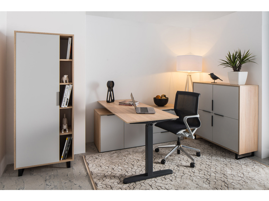 Stylová kancelářská skříň Thor zaujme na první pohled svým designem a praktičností. Celý korpus je vyroben z kvalitního, odolného laminátu, který se skvěle hodí do moderních kanceláří s vysokými nároky na odolnost proti opotřebení. Matně šedá barva a dubový dekor dodávají skříňce osobitost a styl. Kovové úchytky doladí celkový vzhled skříně. Skříň disponuje 3 uzavíratelnými prostornými policemi, a 5 výklenky (neboli nikami), kam pohodlně uložíte veškerý váš inventář. Dolaďte svou kancelář k dokonalosti s produkty Thor. Produkty z této série jsou vyrobeny v tuzemsku a při jejich výrobě byl kladen důraz na kvalitu.