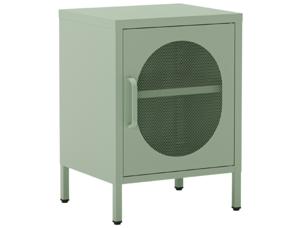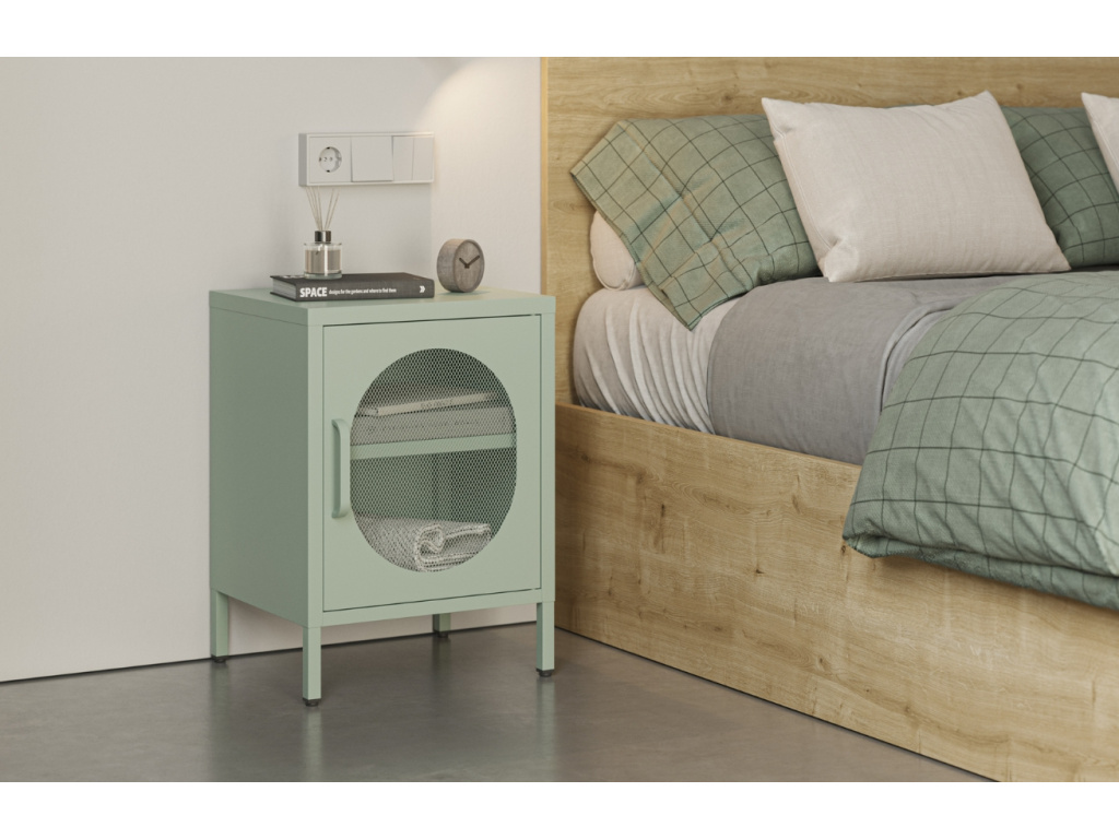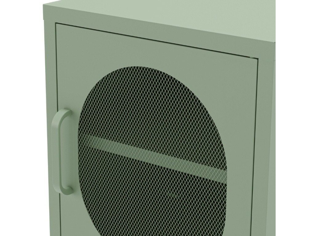Kovový noční stolek Diora v mátově zeleném provedení vnese do vaší ložnice osobitý šmrnc. Perforovaná dvířka s oblým dekorem odhalují úložný prostor se dvěma praktickými policemi. Nábytek perfektně zapadne do industriálních, eklektických nebo minimalistických interiérů. Ve stejnojmenné kolekci najdete také TV stolky a komody v pěti barevných variantách.
