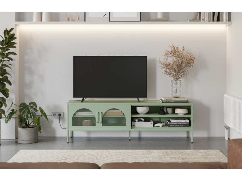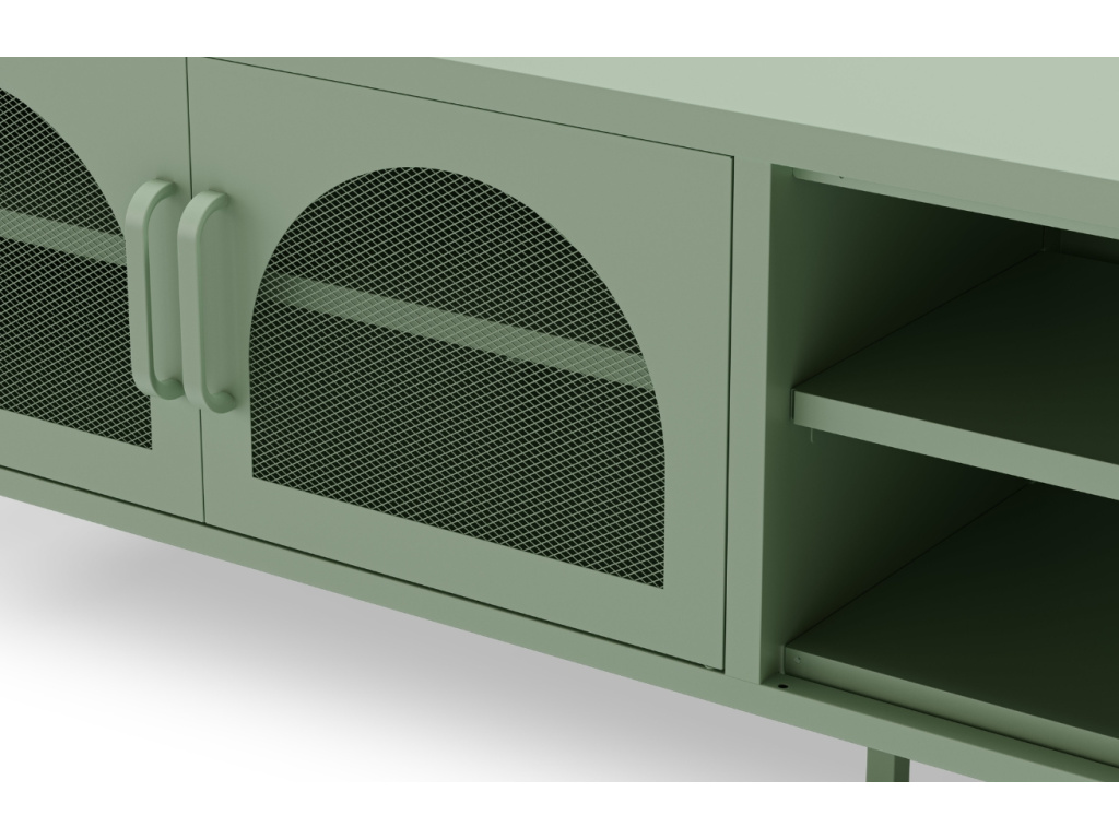 TV stolek Diora je vyroben z práškově lakovaného kovu v mátově zeleném odstínu. Kovová dvířka se zaobleným perforovaným dekorem ukrývají praktický úložný prostor, další místo nabízejí dvě otevřené police. Díky své výrazné barvě a industriálnímu charakteru vynikne v retro, urban nebo eklektickém interiéru. Kolekce Diora zahrnuje i noční stolky, komody a skříně v pěti stylových odstínech.