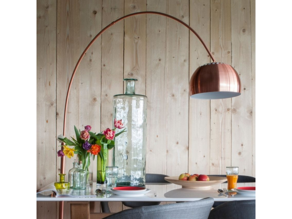 Oblouková stojací lampa ZUIVER BOW v měděném provedení a mramorovým podstavcem. Podstavec z mramoru má na sobě kryt opět s měděným vzhledem. Mramor zaručuje stabilitu zatímco měď eleganci a minimalistický vzhled.
