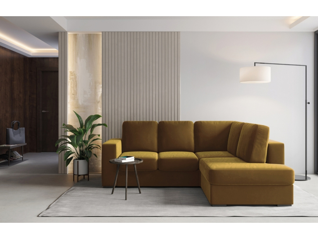 Designová rohová pohovka Mesonica Lago disponuje elegantním a moderním tvarem, proto dovede vaše pohodlí k dokonalosti. Pohovka je čalouněna sametovou tkaninou v medově žlutém provedení. Možnost rozložení a vytvoření tak pohodlné postele je příjemnou výhodou. Lago je charakteristické svou odolností a skvěle zapadne do všech interiéru.