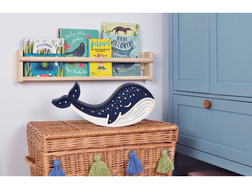 Tato originální lampička ve tvaru velryby od Peekaboo bude funkčním doplňkem a zároveň kouzelnou dekorací do dětského pokoje! Pyšní se ruční výrobou z masivního borovicového dřeva polských lesů, a je natřena bezpečnými akrylovými barvami. Má energeticky úsporné LED diody s velmi dlouhou životností, které poskytují příjemné teplé světlo. Lampička funguje na AA baterie, díky kterým ji lze snadno umístit kamkoliv dle potřeby. Kryt baterie je zajištěn šrouby, aby jej žádná malá zvídavá ručka nerozbila. Pro děti, které se bojí tmy, bude tato lampička ideálním společníkem při usínání.
