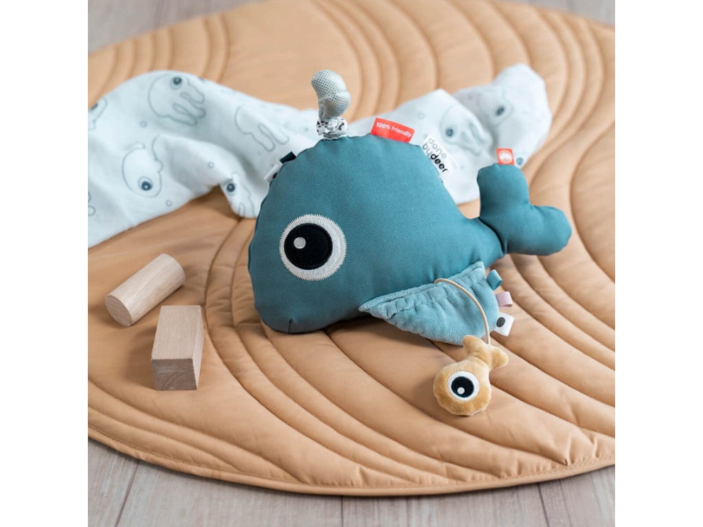 Interaktivní hračka od značky Done by Deer je vhodná pro všechna zvídavá dítka, která rádi prozkoumávají svět. Jakmile se miminko překlopí na bříško, bude velryba Wally jeho nejlepší kamarádkou. V zrcátku, které má velryba na sobě, bude děťátko objevovat a prozkoumávat svoji tvářičku. Pro zvědavé dětské prstíky jsou tady látkové nášivky s různými texturami. Wally na své ploutvi také ukrývá svého malého kamaráda v podobě žluté rybky. Pokud zatáhnete za kapičku vody na hřbetě, velryba bude příjemně vibrovat. Písek ve výplni zajistí, že velryba bude stát na místě, aniž by se převrátila nebo spadla.