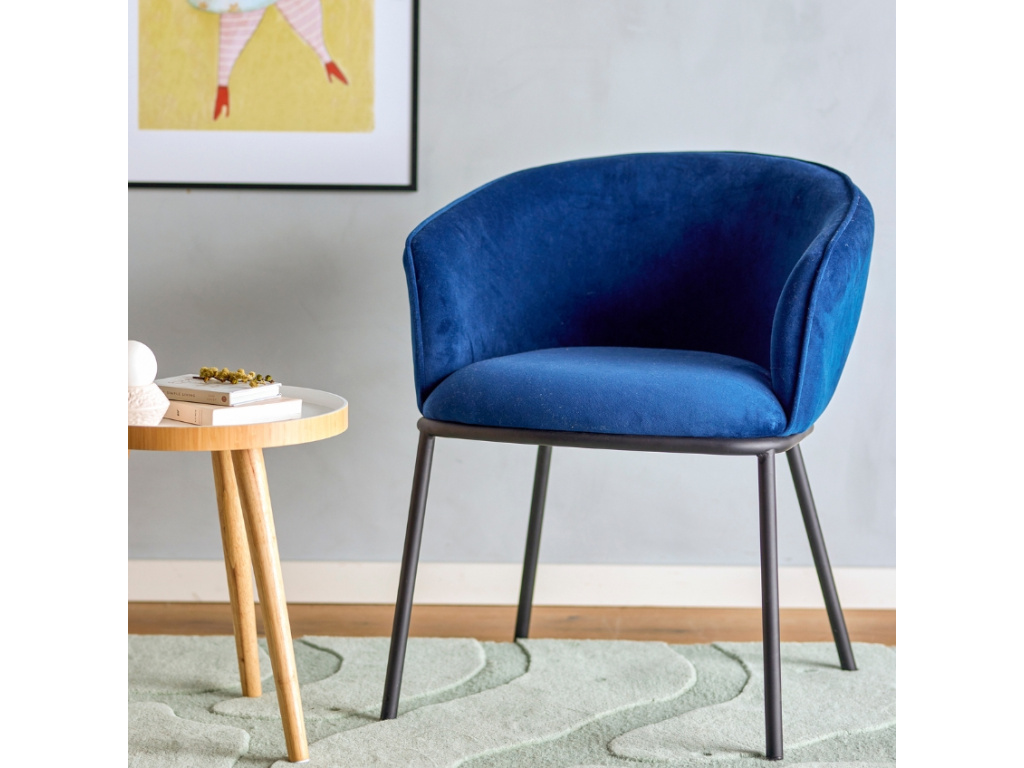 Tuto jídelní židli si zamilujete, pokud milujete design a pohodlí. Židle Cortone s područkami nabízí měkké posezení, díky hebké sametové látce a zajišťuje vysoký komfort, ať už sedíte u jídelního nebo pracovního stolu. Stabilitu židle zajišťuje štíhlá kovová podnož s povrchovou úpravou černého laku. Sytě modrá barva dodá prostoru punc elegance a sofistikovanosti. Židli si oblíbíte i díky nadčasovému designu, který se dokonale hodí do moderně a skandinávsky laděných interiérů.